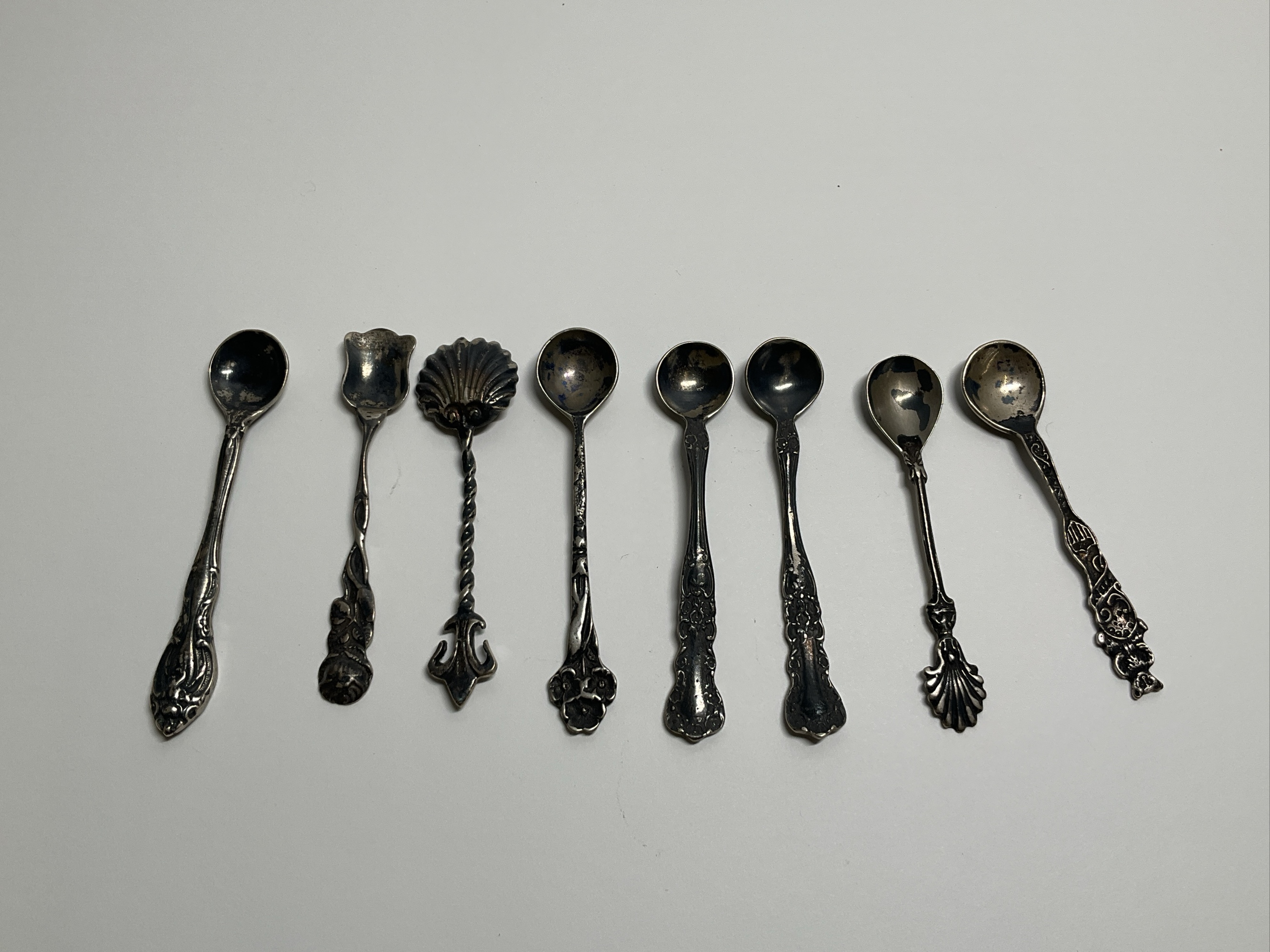 A set of eight miniature sterling silver spoons, each with unique and ornate handle designs. A nice collection for display or use. 2.25 in. long