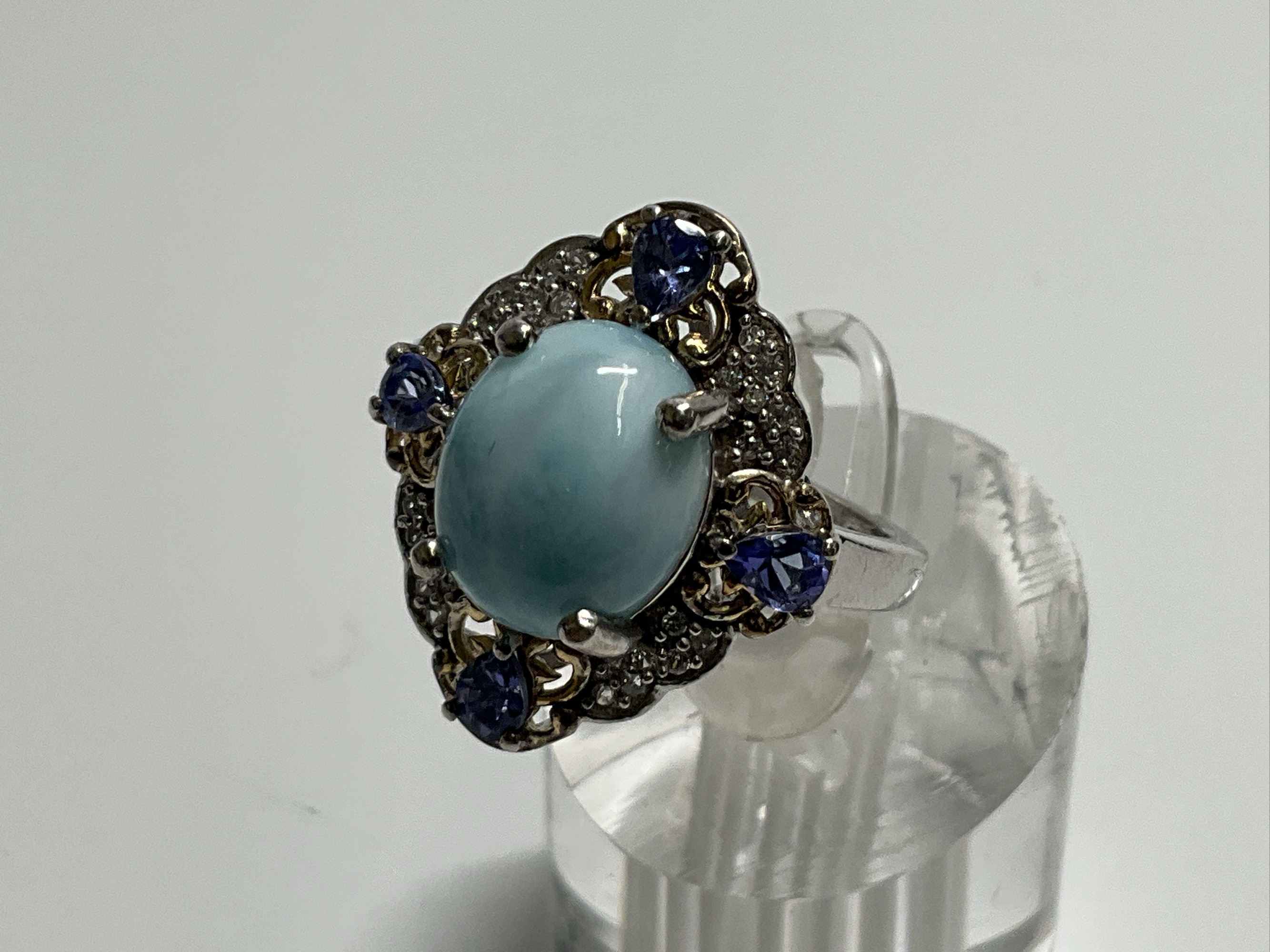 Sterling silver ring featuring a large oval Larimar stone, accented with round blue stones. Ring size 9.