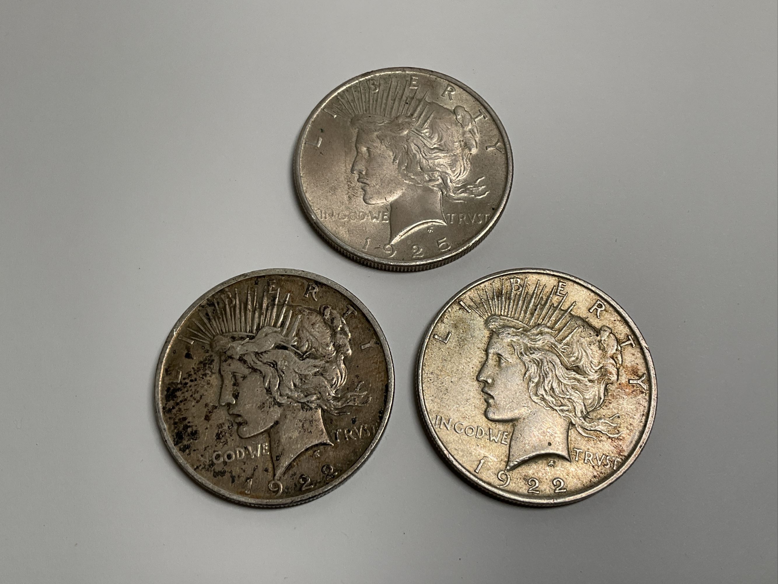 This lot features three Peace Silver Dollars. Dates include 1922 and 1925. A great addition to any collection.