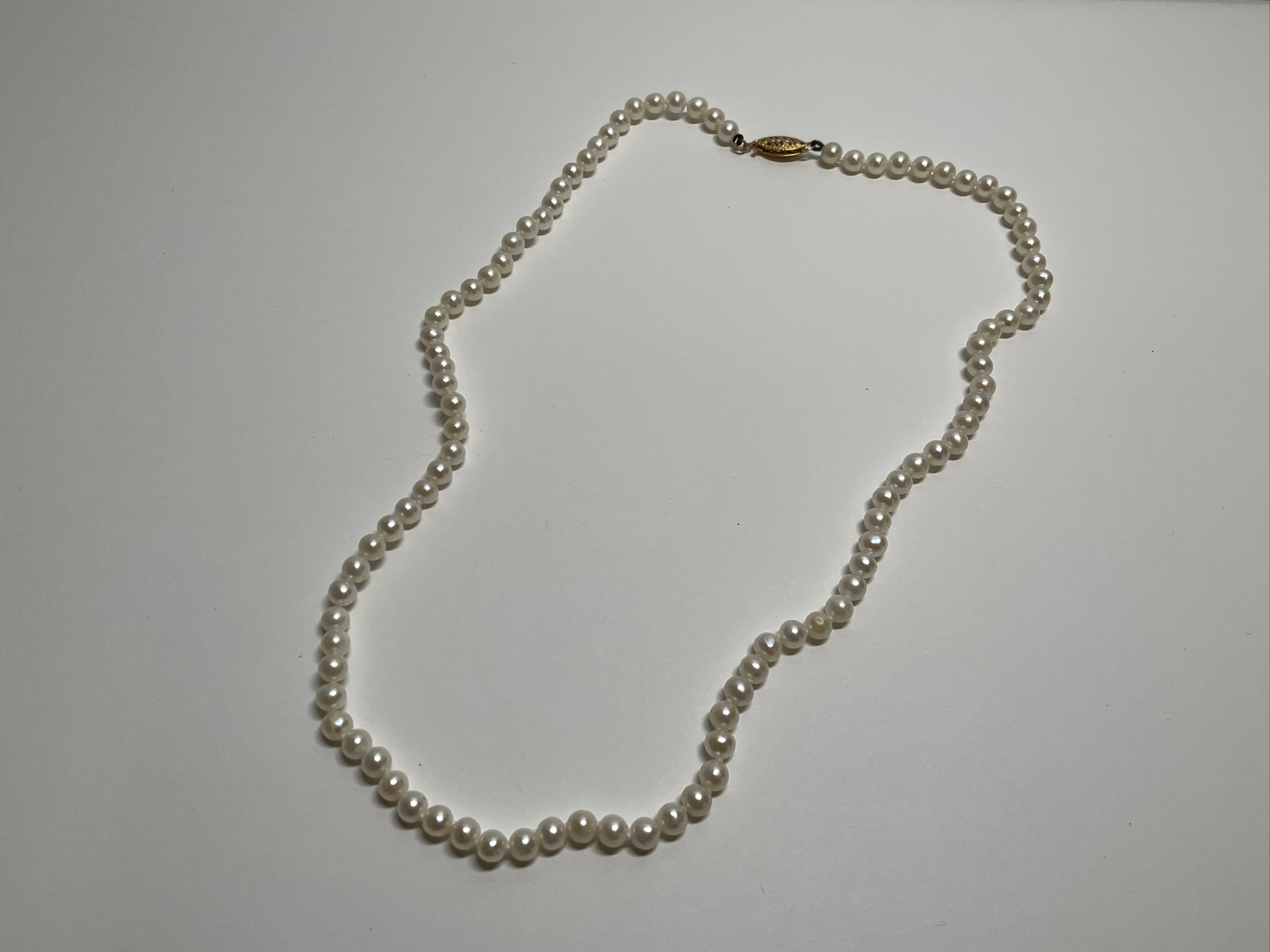 A beautiful strand of white pearls. The necklace is finished with a secure 14K gold clasp. A classic accessory for any occasion.