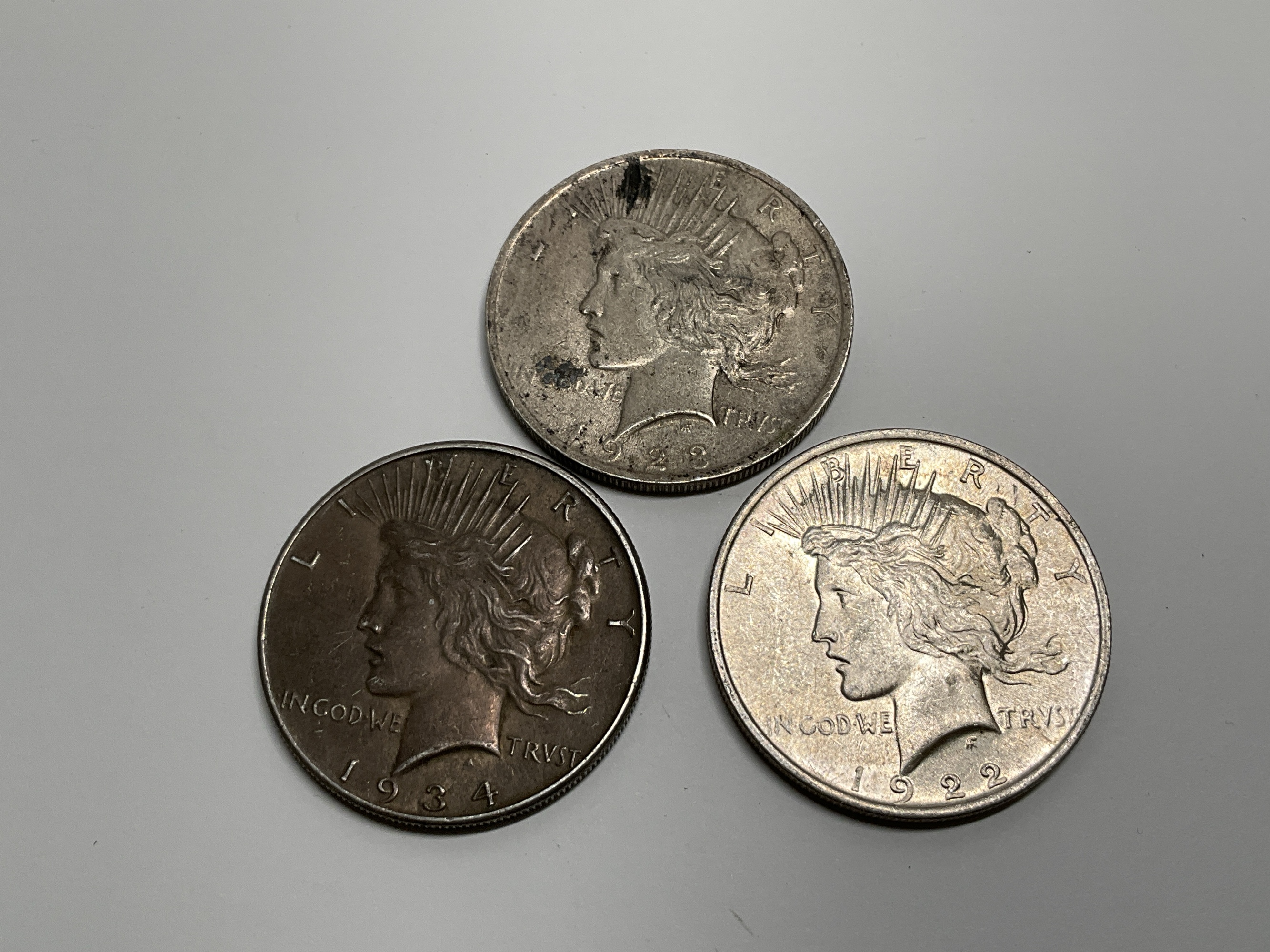 This lot features three United States Peace Silver Dollars. Dates range from 1922 to 1934.