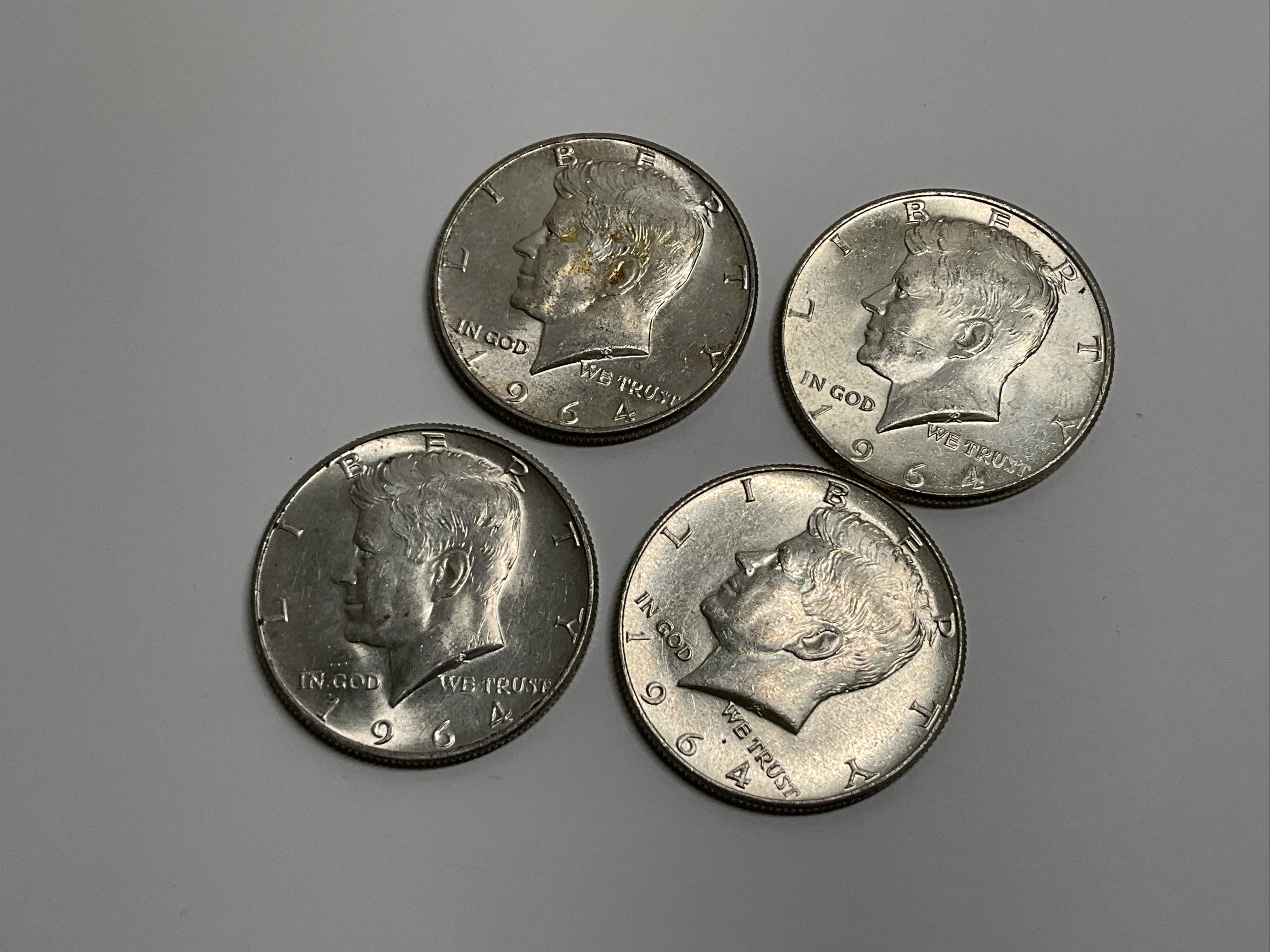 This lot includes four 1964 Kennedy Half Dollar coins.