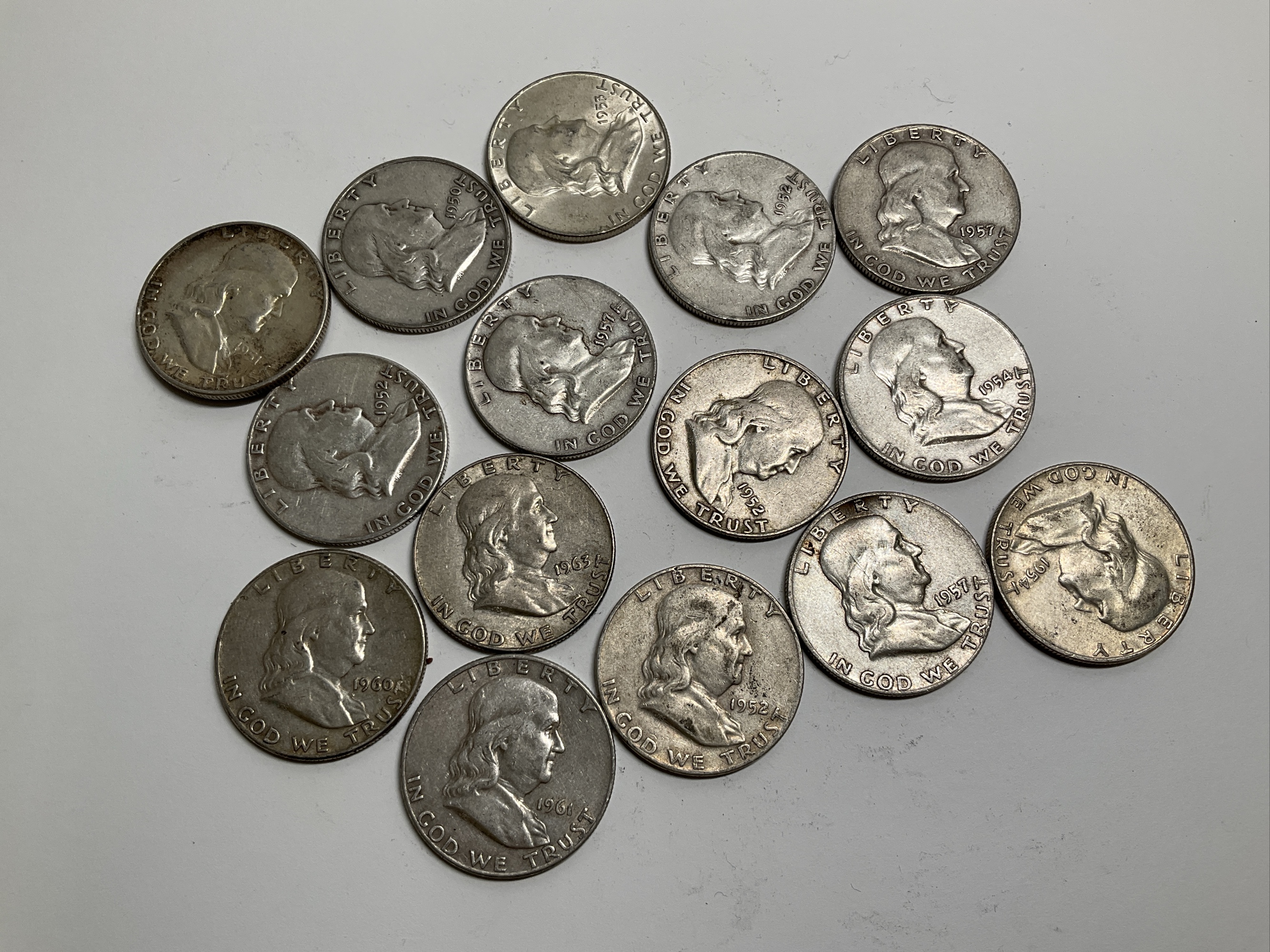Lot of fifteen Franklin Half Dollar coins, dated between 1950 and 1963.