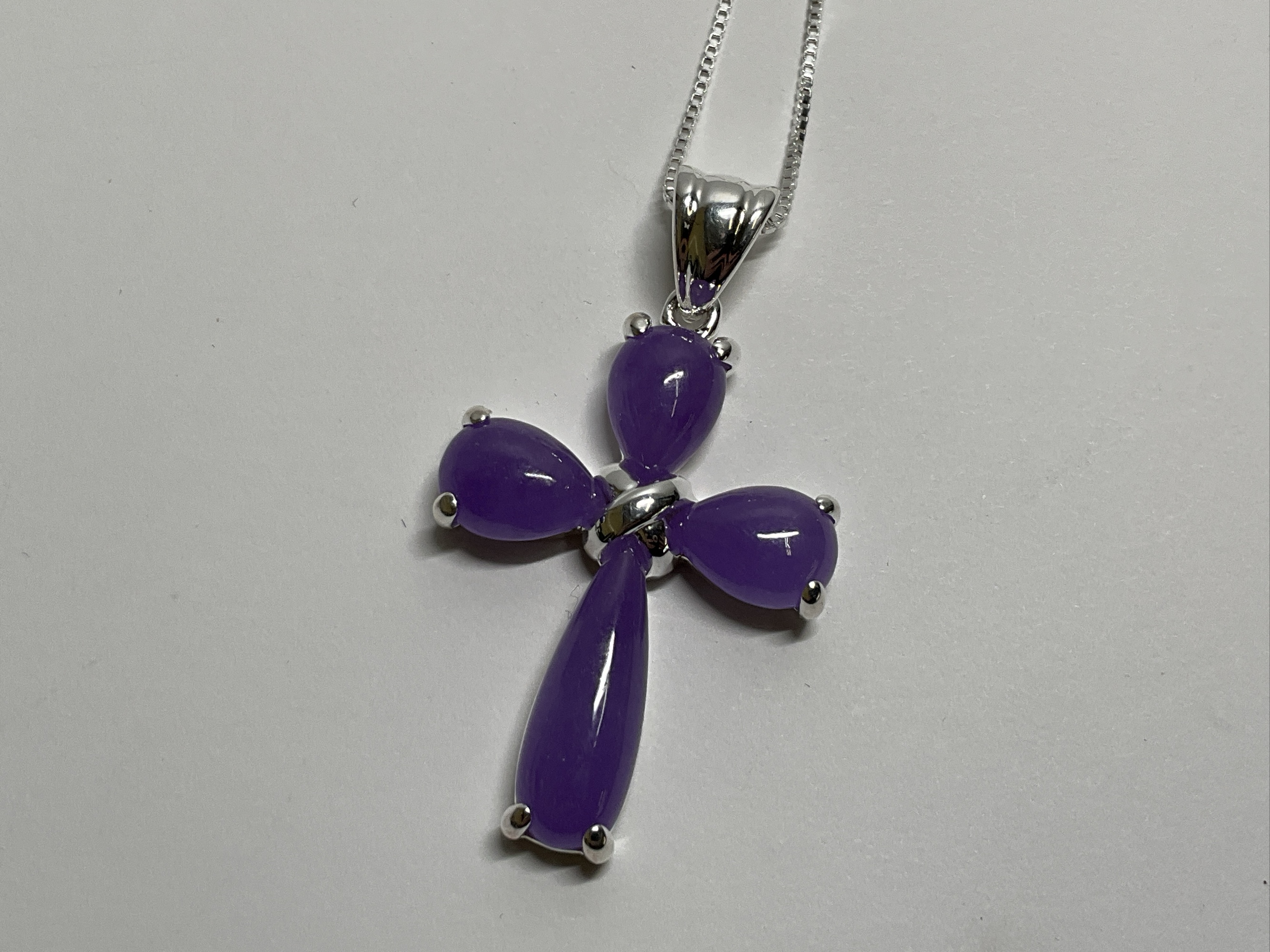 This item features a beautiful sterling silver cross pendant with lavender jade stones. It comes with an 18-inch boxlink necklace, perfect for everyday wear or special occasions. The cross pendant measures 1.625 inches in length.