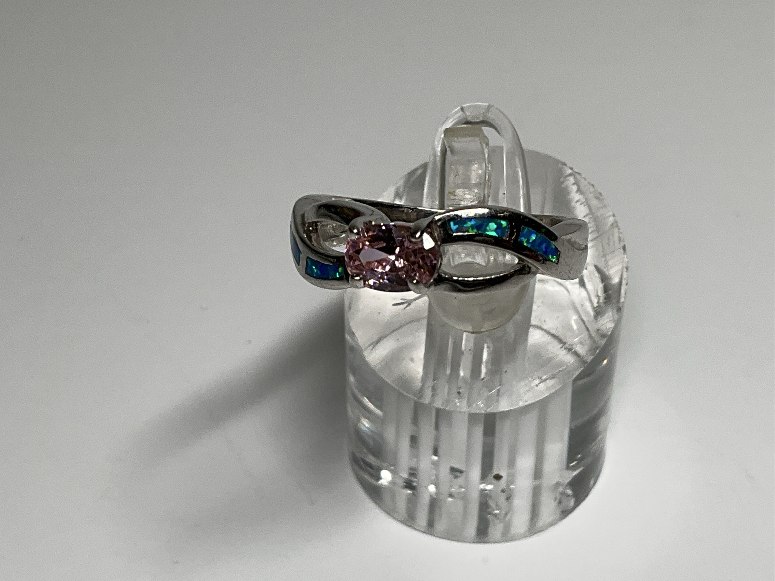 Sterling Silver ring featuring a pink tourmaline gemstone and inlaid opal details. Ring size 8.75.
