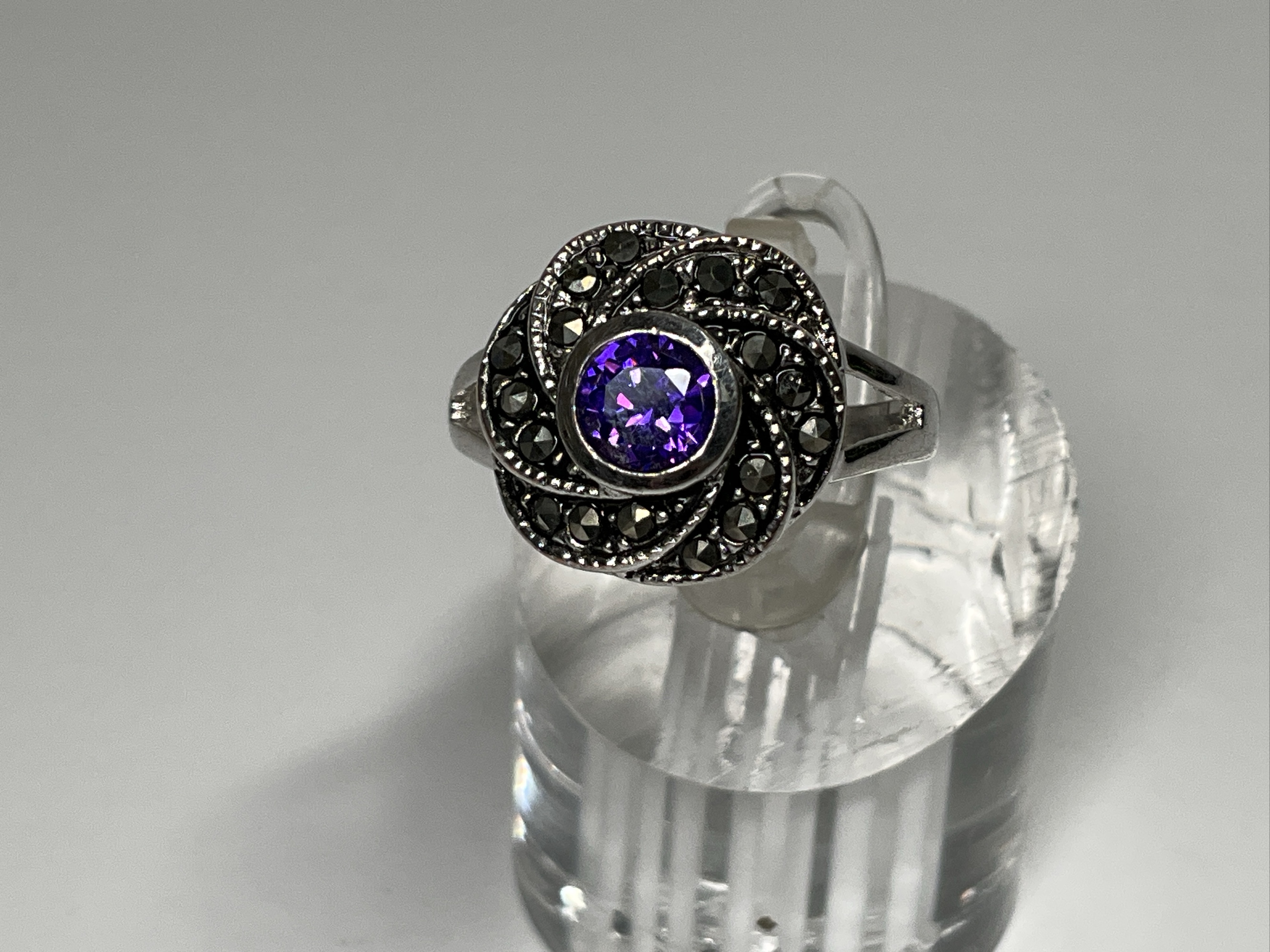 This listing is for a sterling silver ring featuring an amethyst gemstone surrounded by marcasite stones. The ring is a size 6.