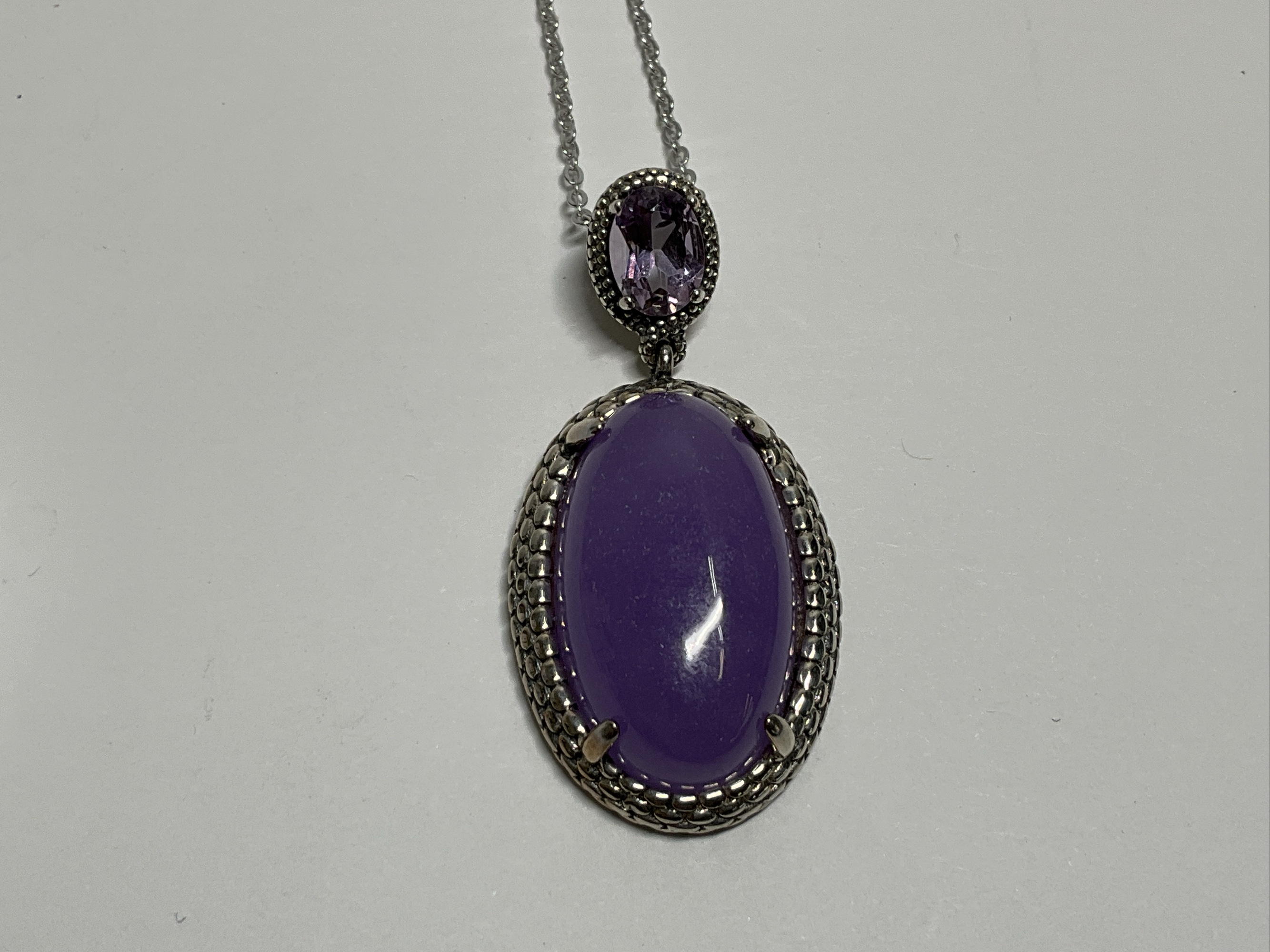 Sterling silver necklace featuring a 13x22mm lavender jade and amethyst pendant. The pendant measures approximately 1.5 inches in length and the necklace is 18 inches long.