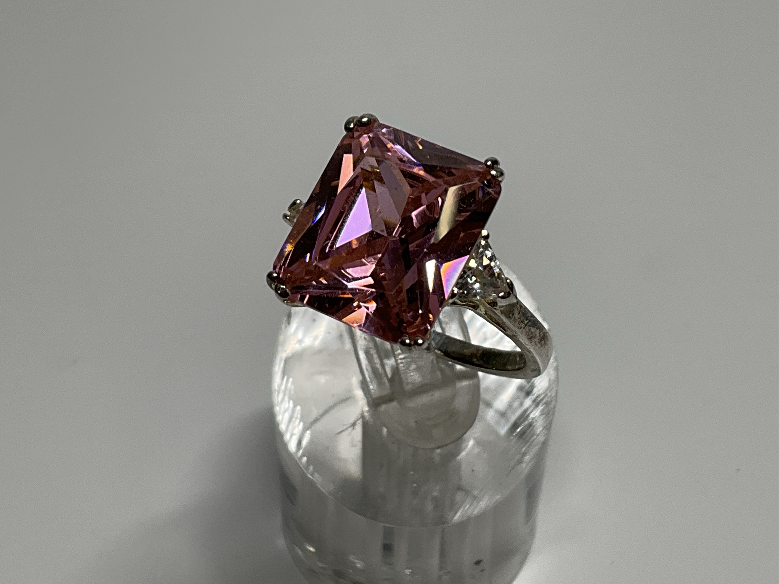 Sterling silver ring featuring a 12x14 mm asscher cut pink CZ gemstone with cz accents. Size 8