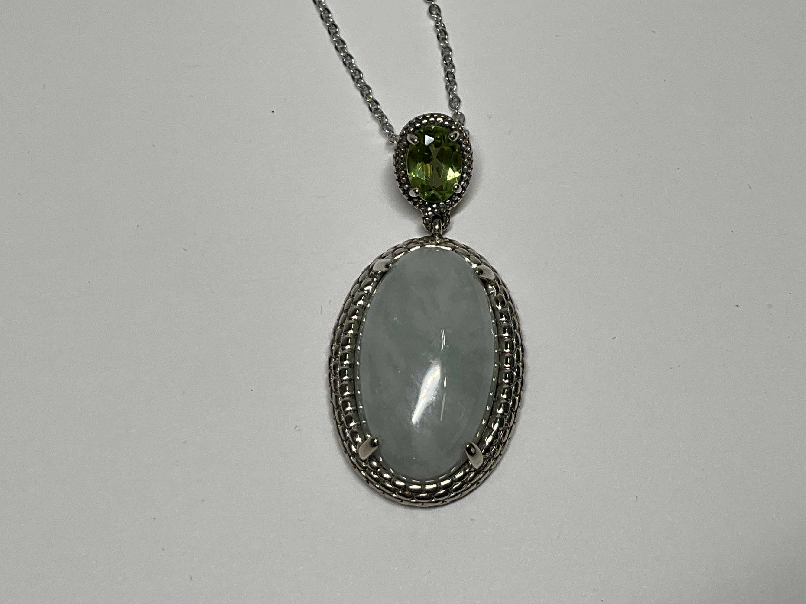 Sterling silver necklace with 13x22mm green jade and peridot 1.5 inch pendant and 18 inch necklace