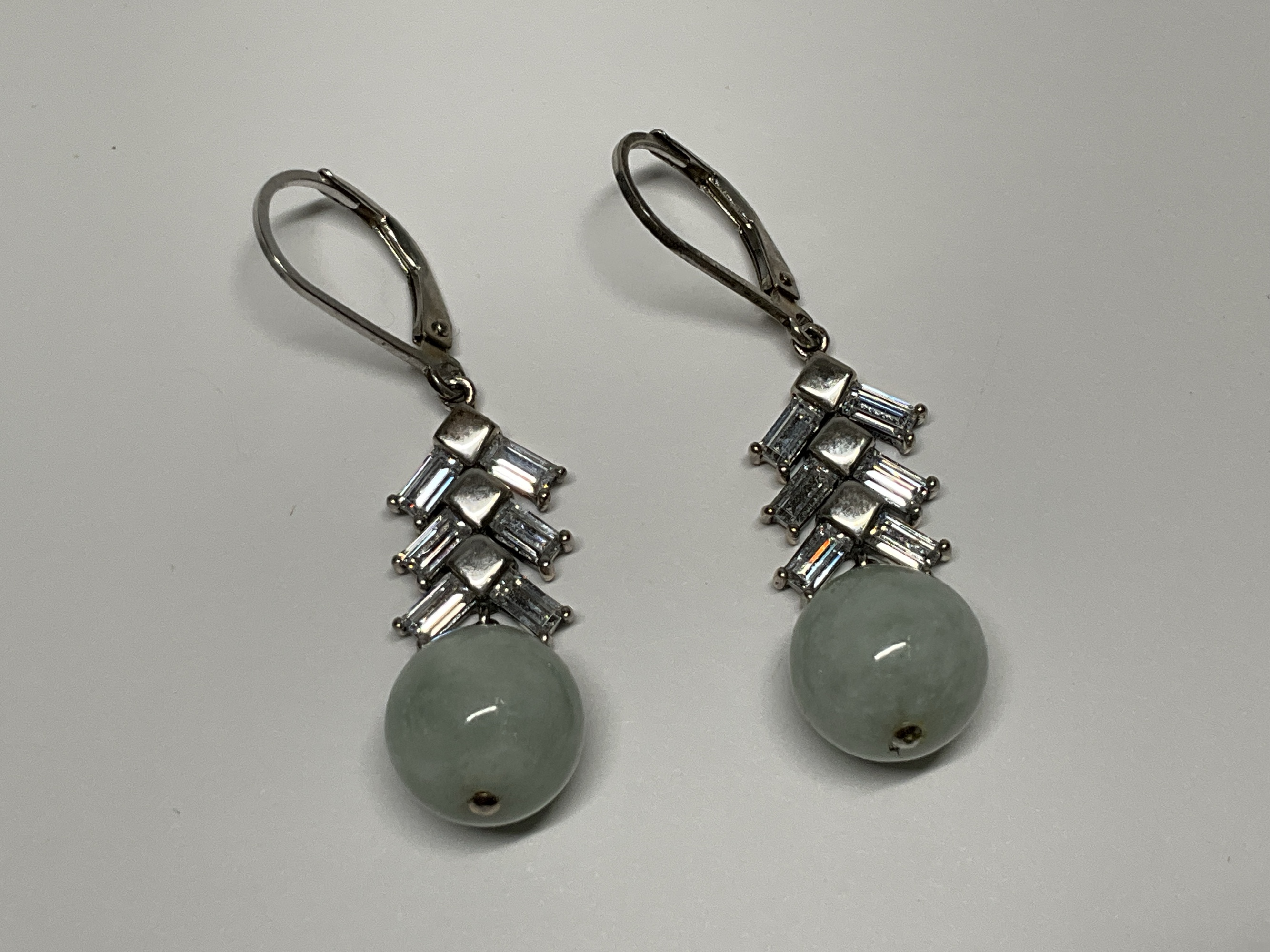 Pair of sterling silver leverback dangle earrings featuring 10mm green jade spheres and multi baguette cubic zirconia accents. Each earring measures approximately 1.5 inches in length.