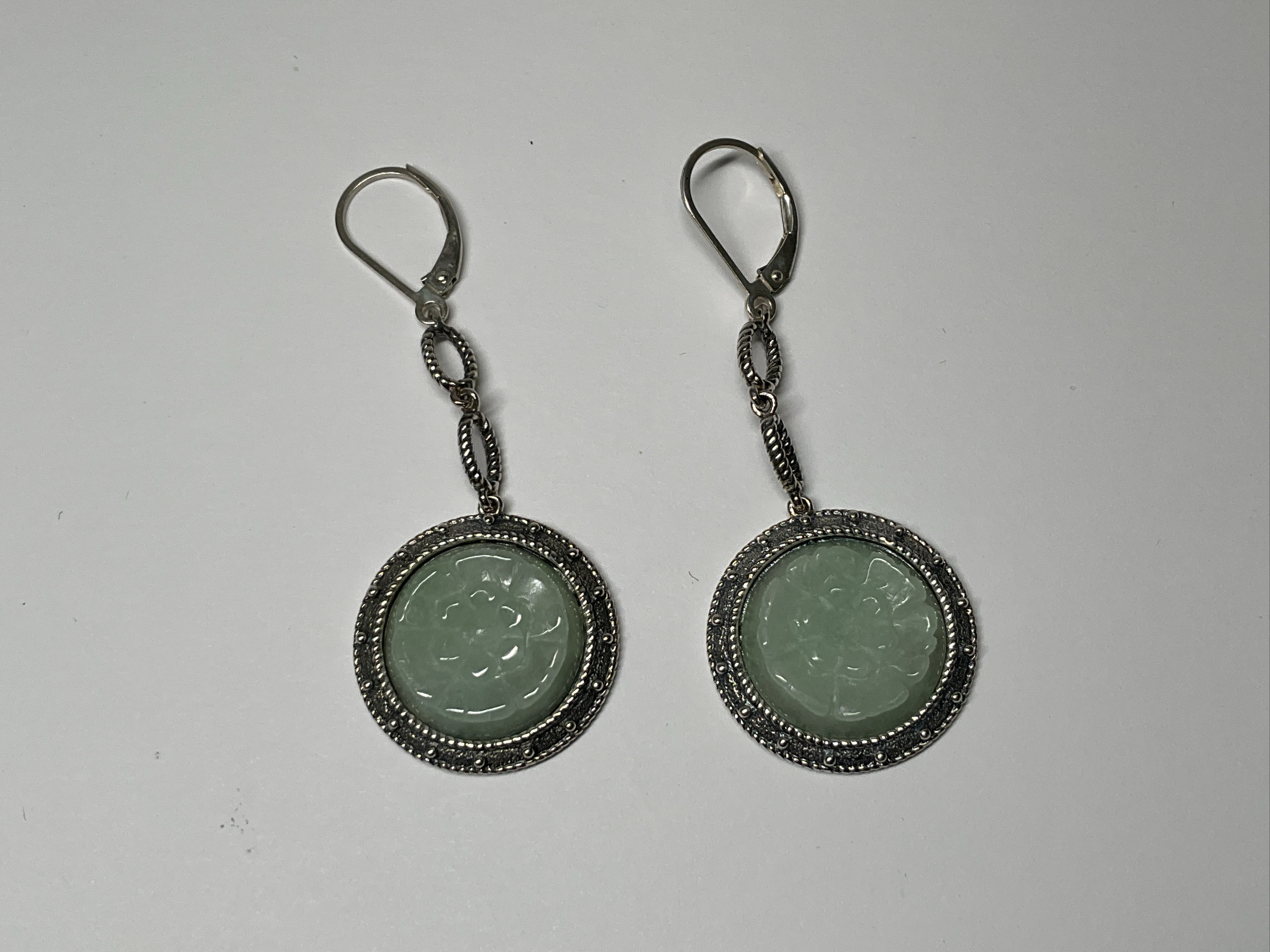 Sterling Silver, 16mm Art Carved Green Jade Leverback 2in. Double Dangle Earrings.
