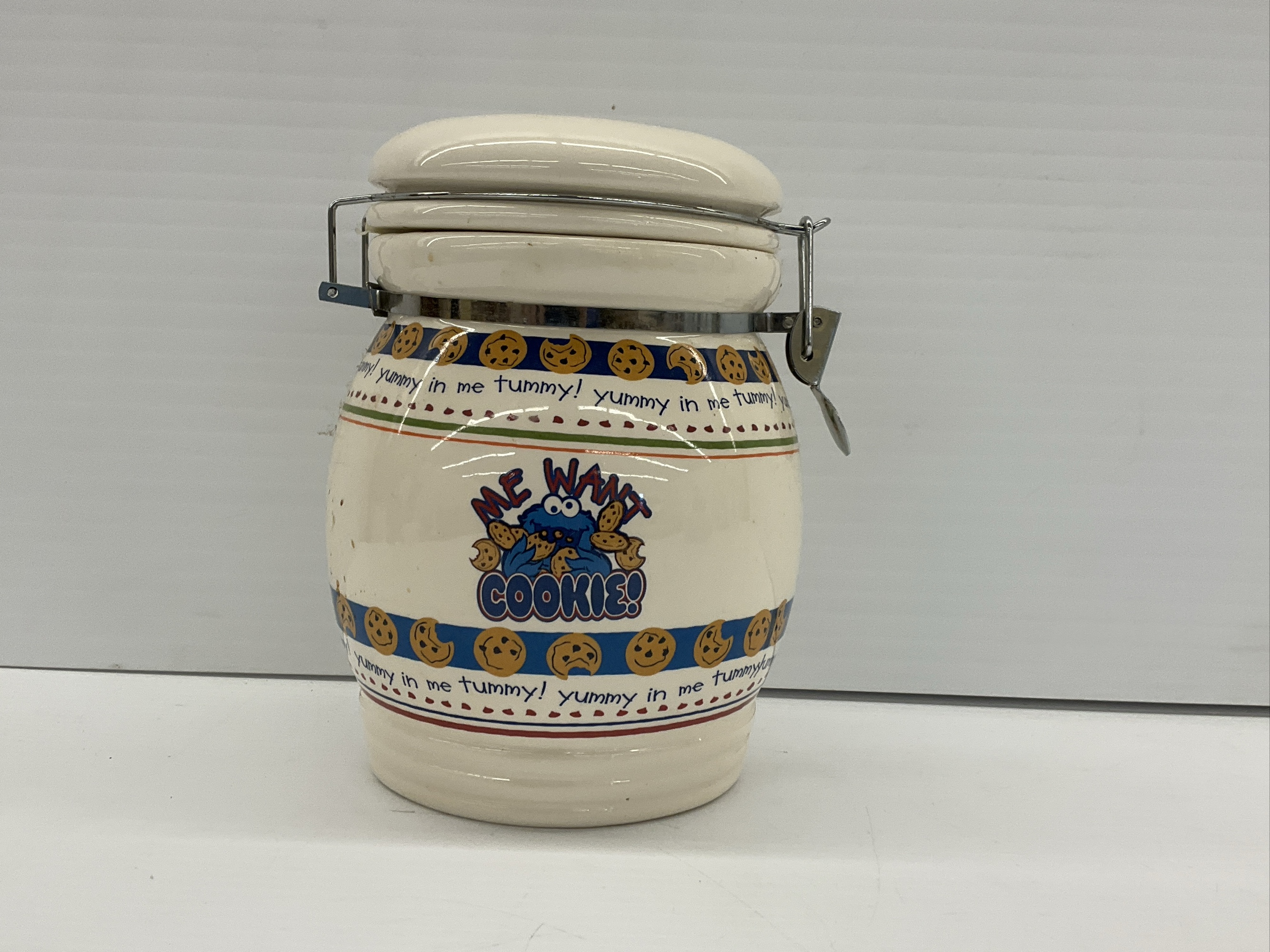 Ceramic cookie jar featuring Cookie Monster from Sesame Street. Jar has a flip-top lid and is decorated with "Me Want Cookie!" and "Yummy in me tummy!" designs. 8 x 5 in.
