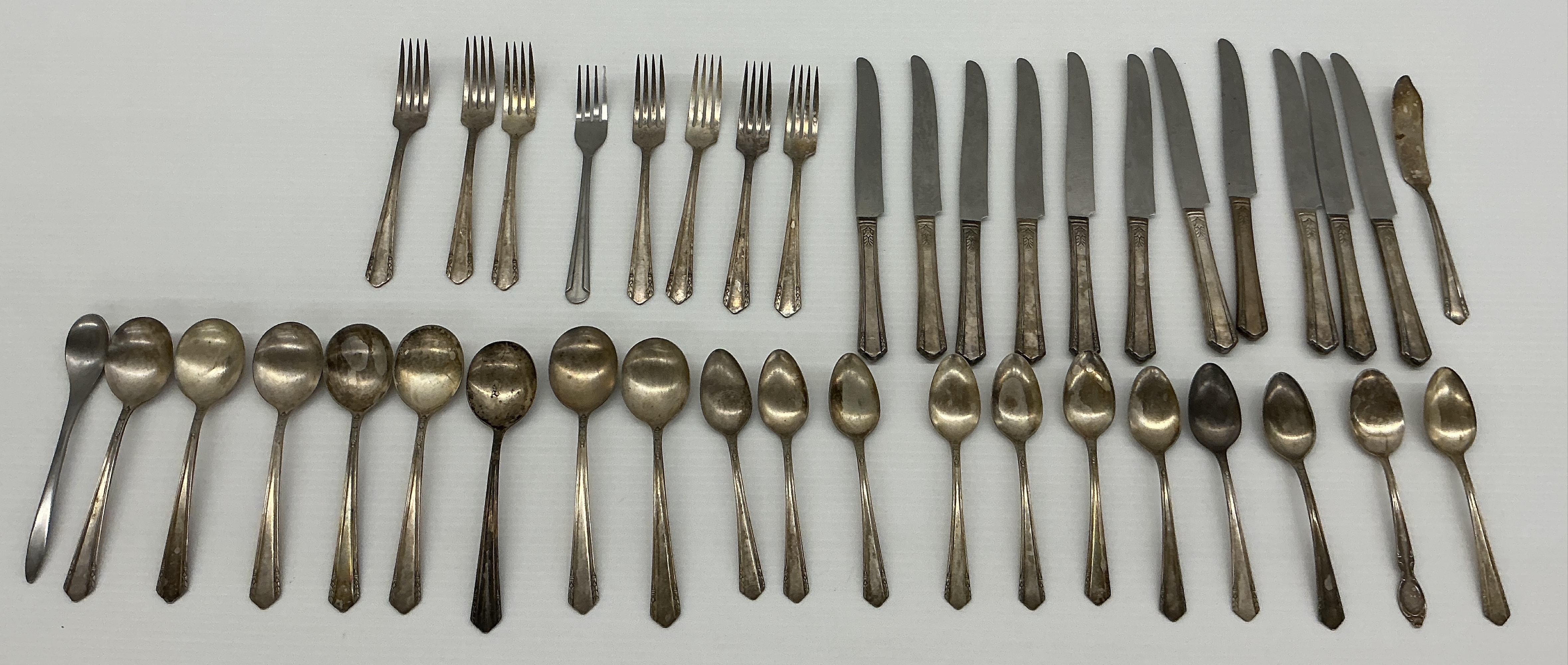 This lot includes a variety of 40 flatware pieces, featuring knives, forks, and spoons. Some are marked 'Stainless Japan,' while others show 'W.H.A. Rogers A1 Plus' and 'Playboy'.