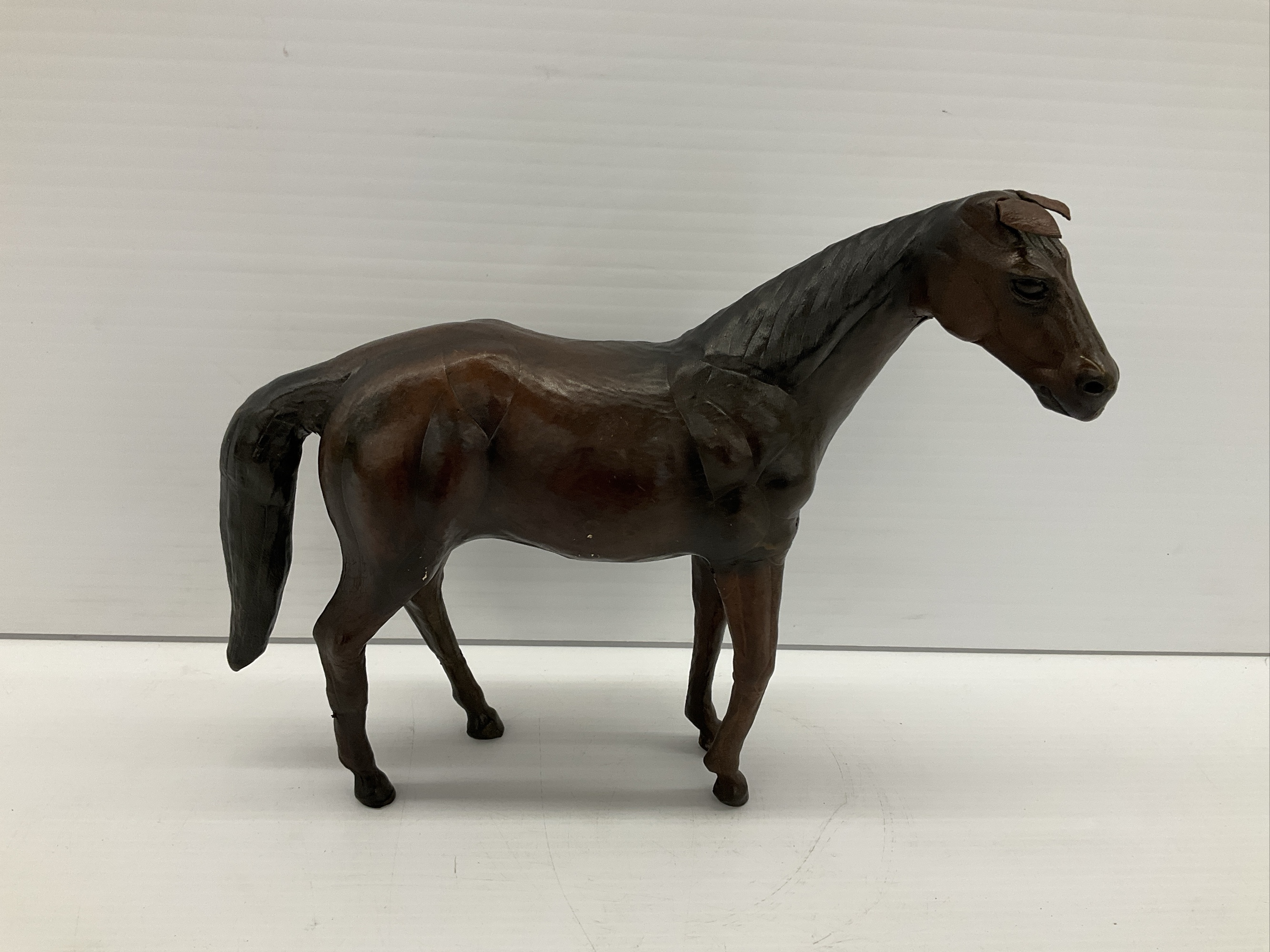 This listing features a beautifully handcrafted leather horse figurine. The horse is finished in a rich brown color with a detailed design. A unique piece for collectors or anyone looking for a distinctive decorative accent. 12 x 14 in.