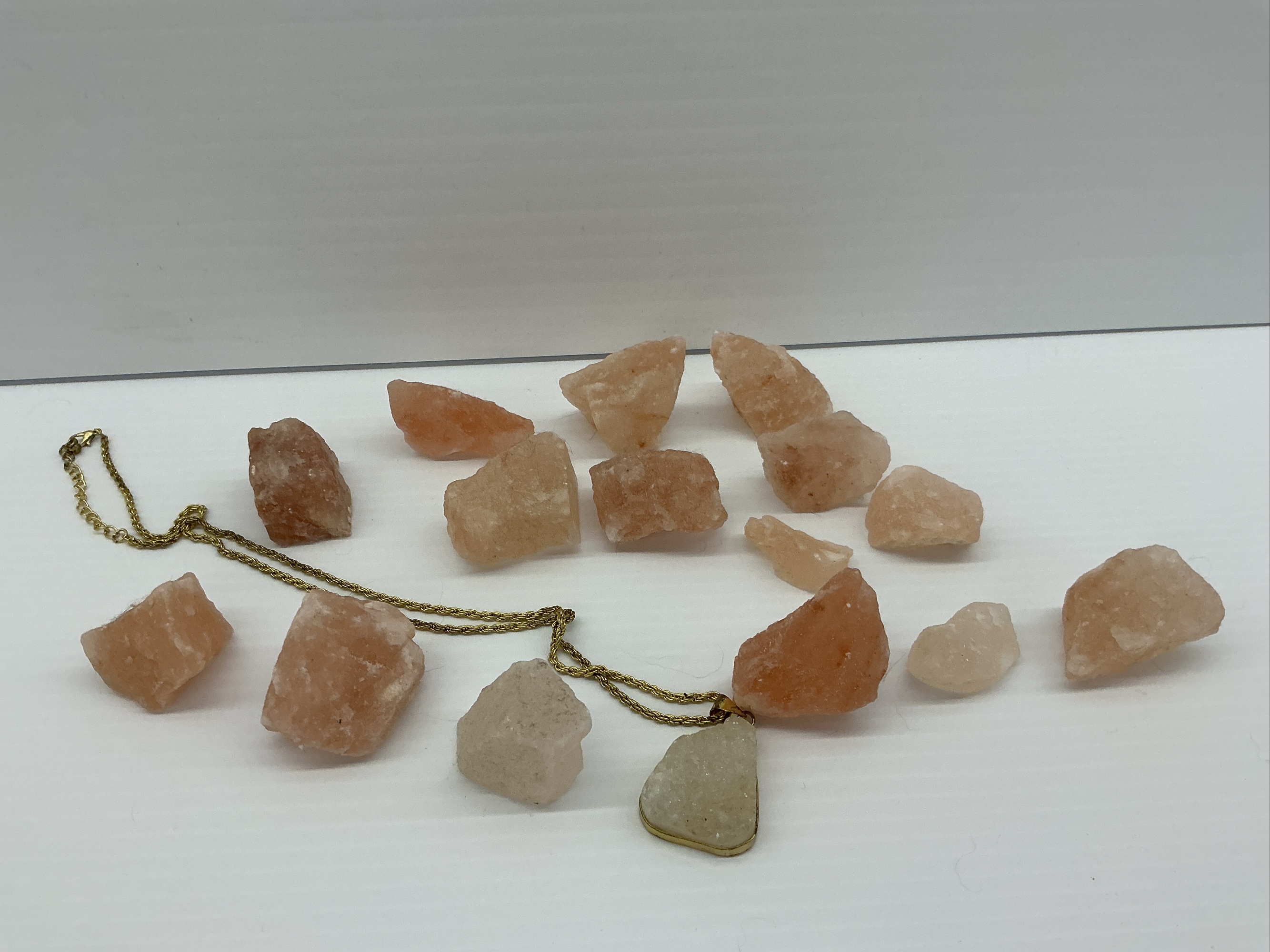 This auction features a collection of rough-cut Pink Himalayan Salt chunks. Also included is a necklace with a chunk set in gold toned metal. A unique and potentially therapeutic collection.
