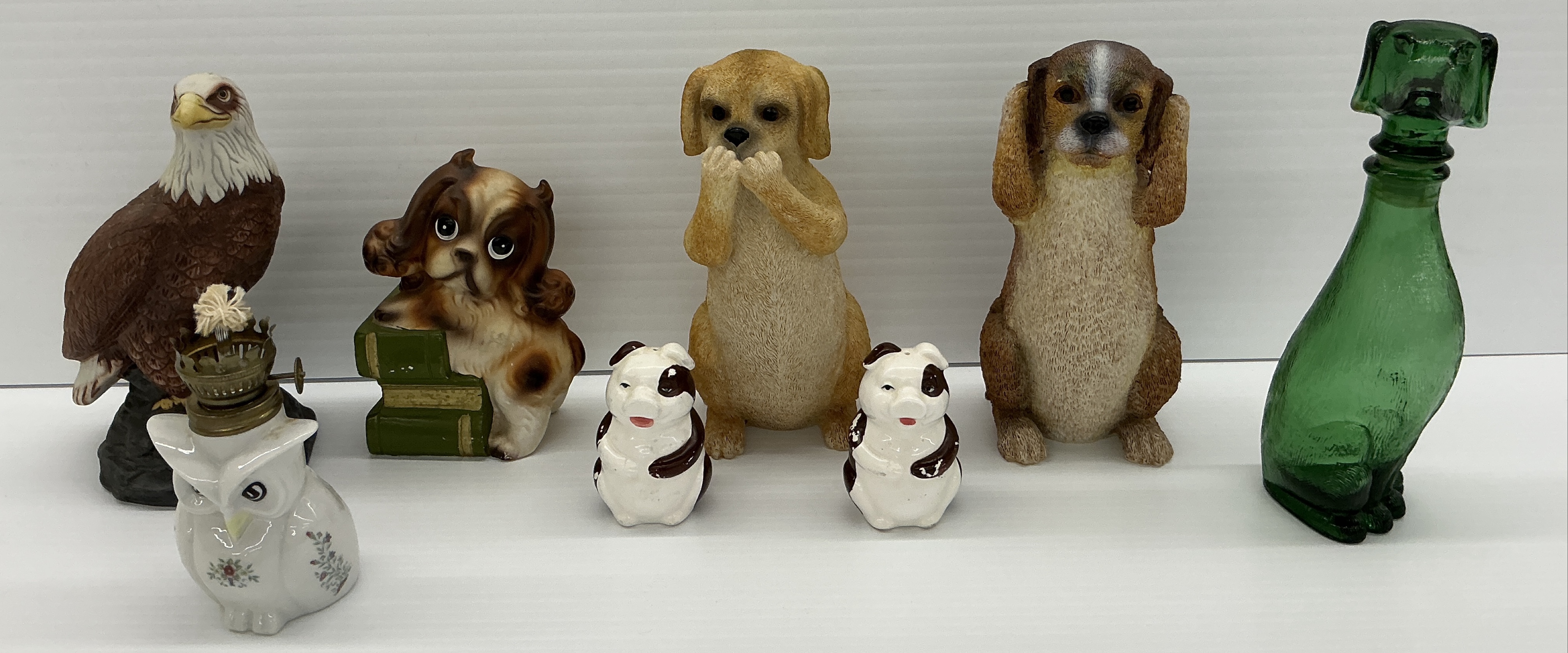 This listing features a diverse assortment of decorative figurines. Included are several dog figurines, including two playful small ones, two larger dogs (one with hands over its mouth and one with hands over its ears), and a unique green glass dog-shaped bottle. There's also an Avon 'Pride of America' eagle figurine, and owl oil lamp. One figurine is sitting on a stack of books and marked 'Made in Japan'. Tallest 9 in.