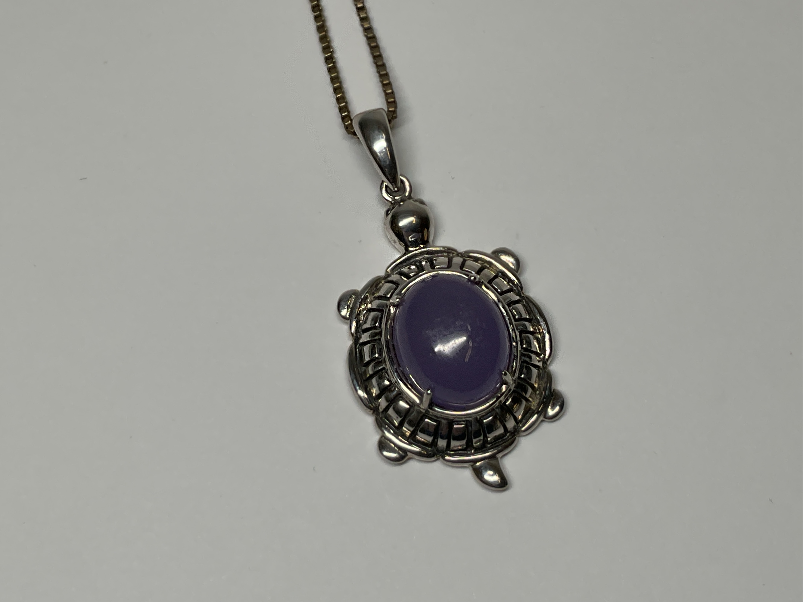 Sterling Silver 8x10mm Lavender Jade 1.25 inch Turtle Pendant on an 18 inch Boxlink Necklace.