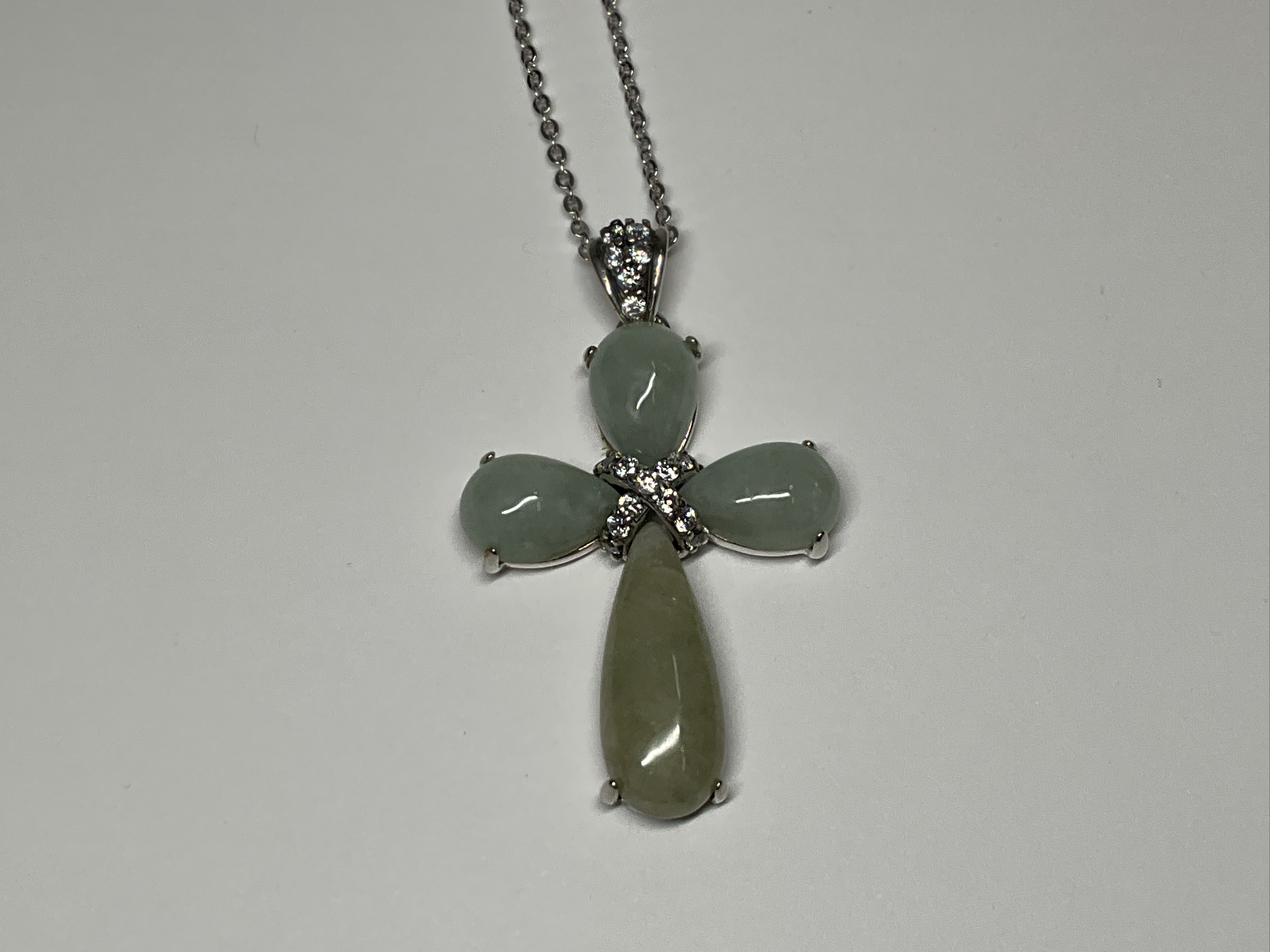 Sterling Silver necklace with a green jade and cubic zirconia gem cross pendant. Pendant is approximately 1.5 inches. Necklace is approximately 18 inches.