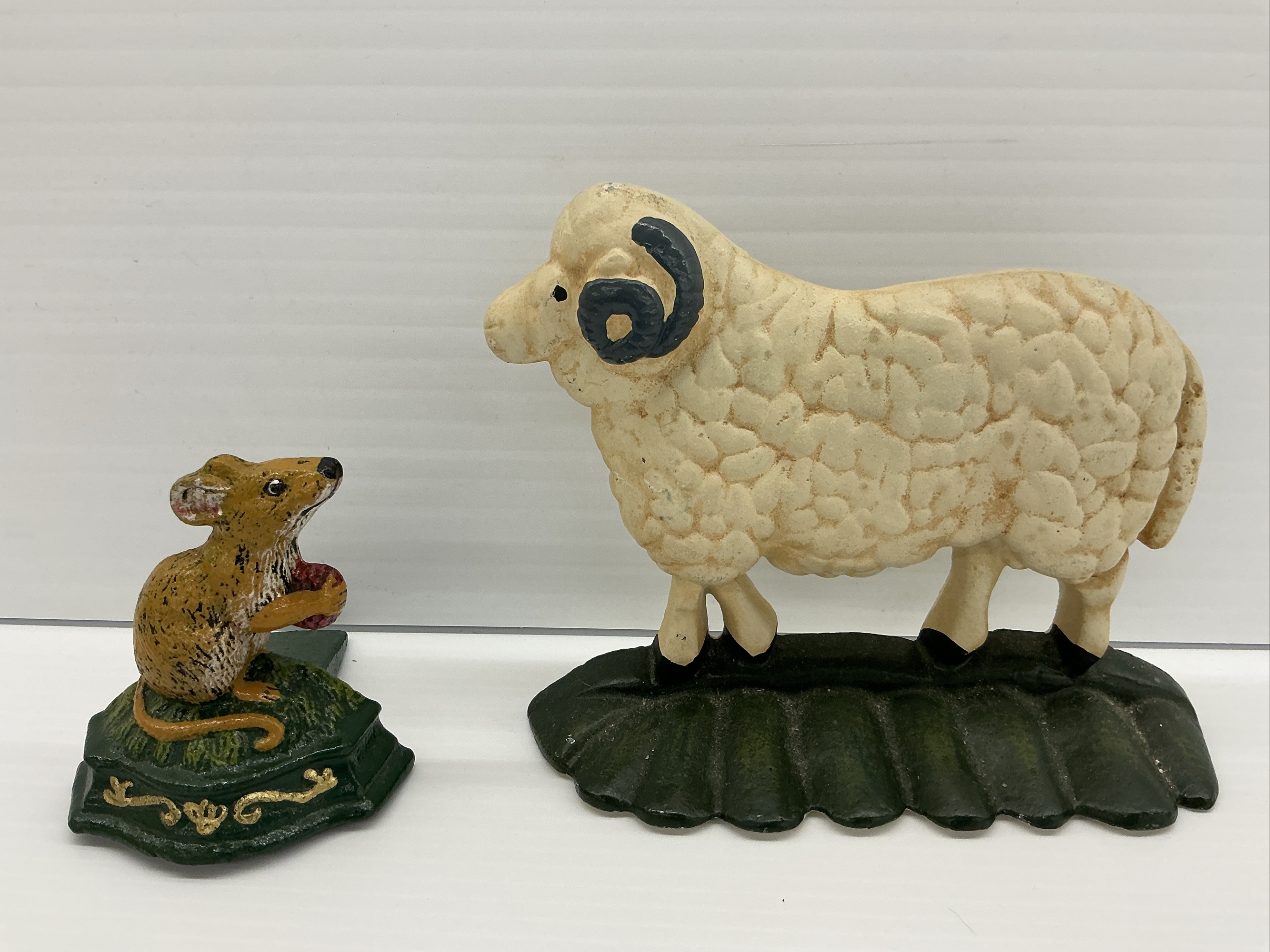 Two cast iron doorstops, one featuring a mouse holding a raspberry, and the other depicting a sheep. Tallest 6.25 in.