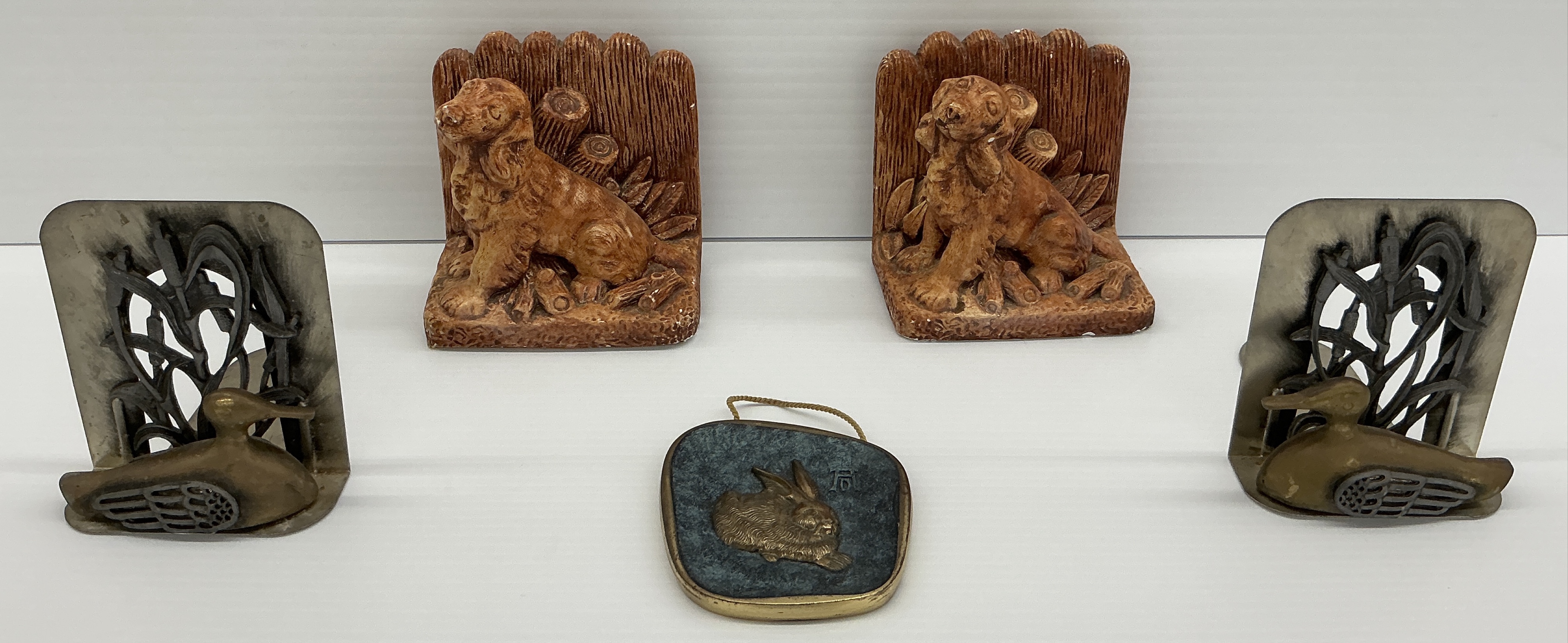 This lot includes a variety of decorative bookends, including a pair of ceramic dog-themed bookends with markings on the bottom and a pair of metal bookends with duck and plant motif. Additionally, there is a rabbit wall hanging with a metallic design and a cord for hanging. Tallest 6 in.