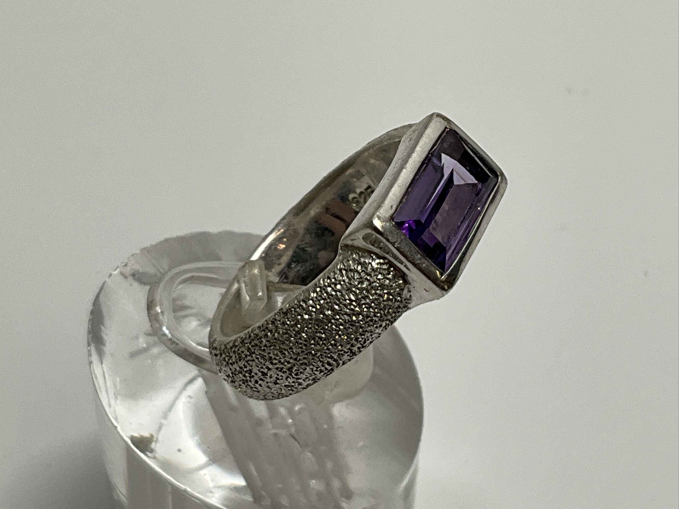 Sterling silver ring featuring an amethyst gemstone and a unique, textured band design. Ring size is 7.
