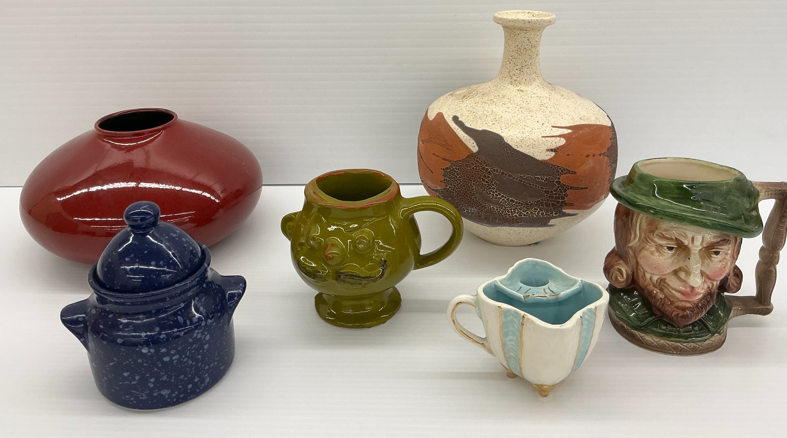 A diverse assortment of decorative pottery. This lot features two vases, one in a smooth red finish and another with earth-tone abstract designs. There's also a stoneware jar with lid, along with an assortment of decorative mugs, including one with a face on it and another face themed mug with a handle that resembles a wooden staff. Additionally, a small decorative cup with feet is included. Several pieces are marked on the bottom. Tallest 9.75 in.