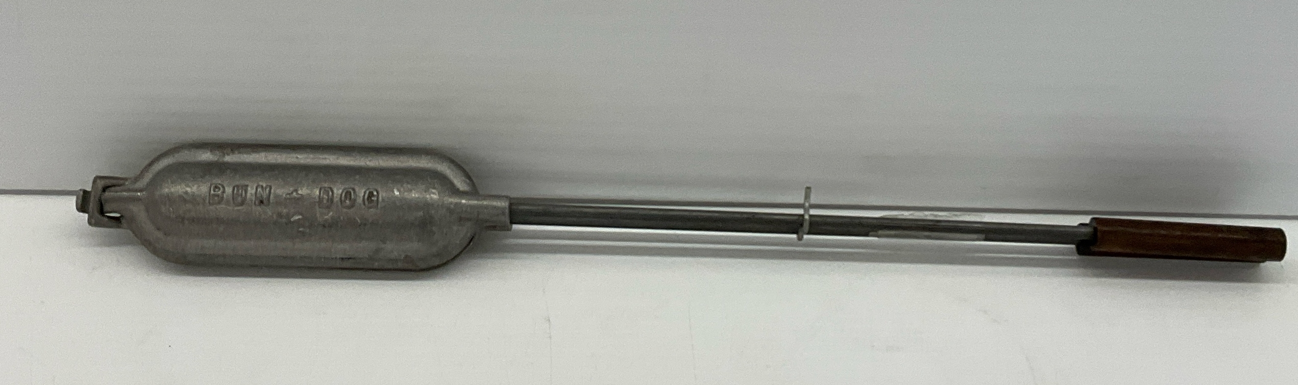 Two Bun Dog metal hot dog cooker irons with long handles. 22 in. long