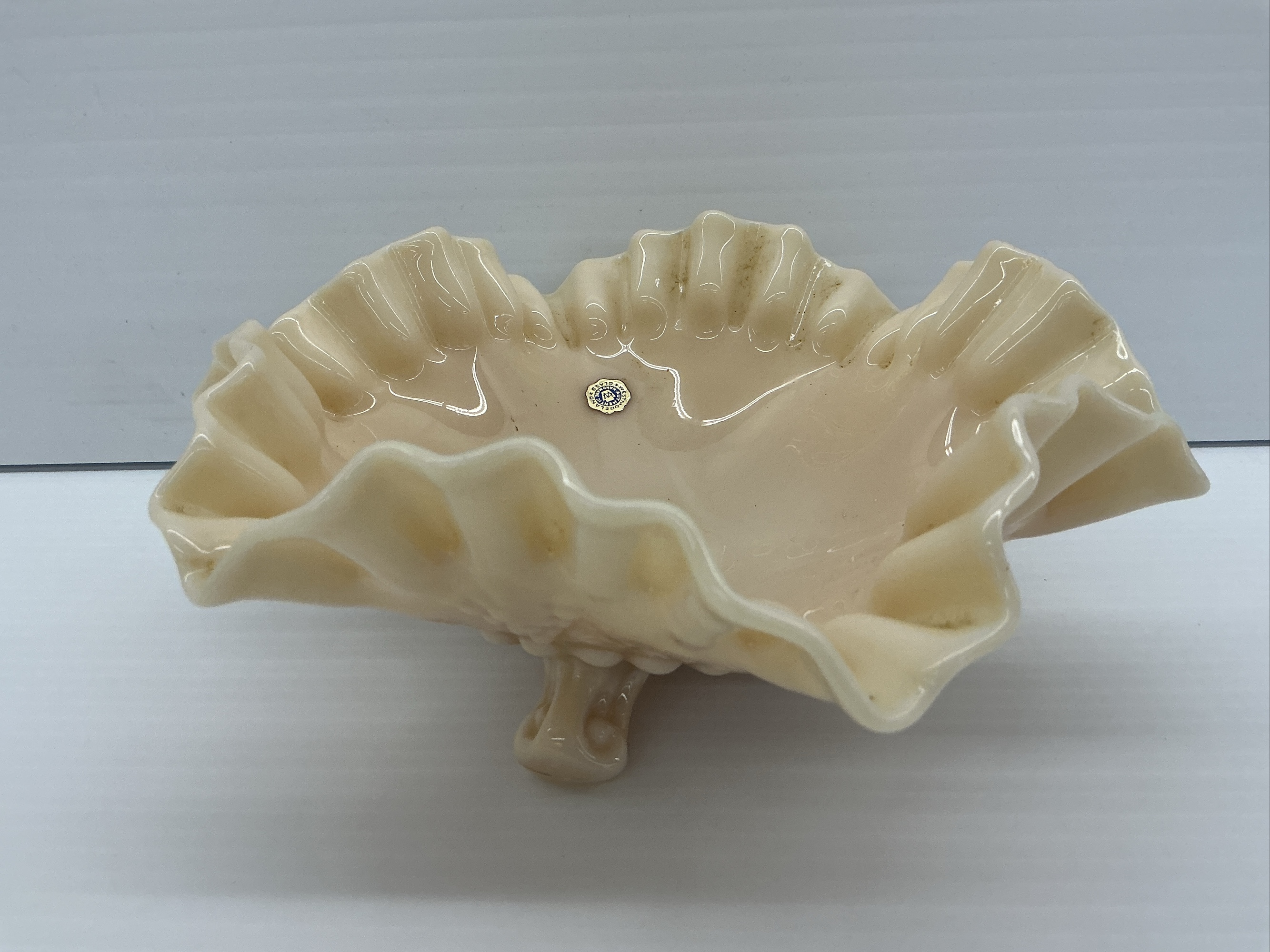 Almond milk glass Westmoreland bowl. Paneled grape pattern. Approx. 3.5 in. tall x 8 in. wide.
