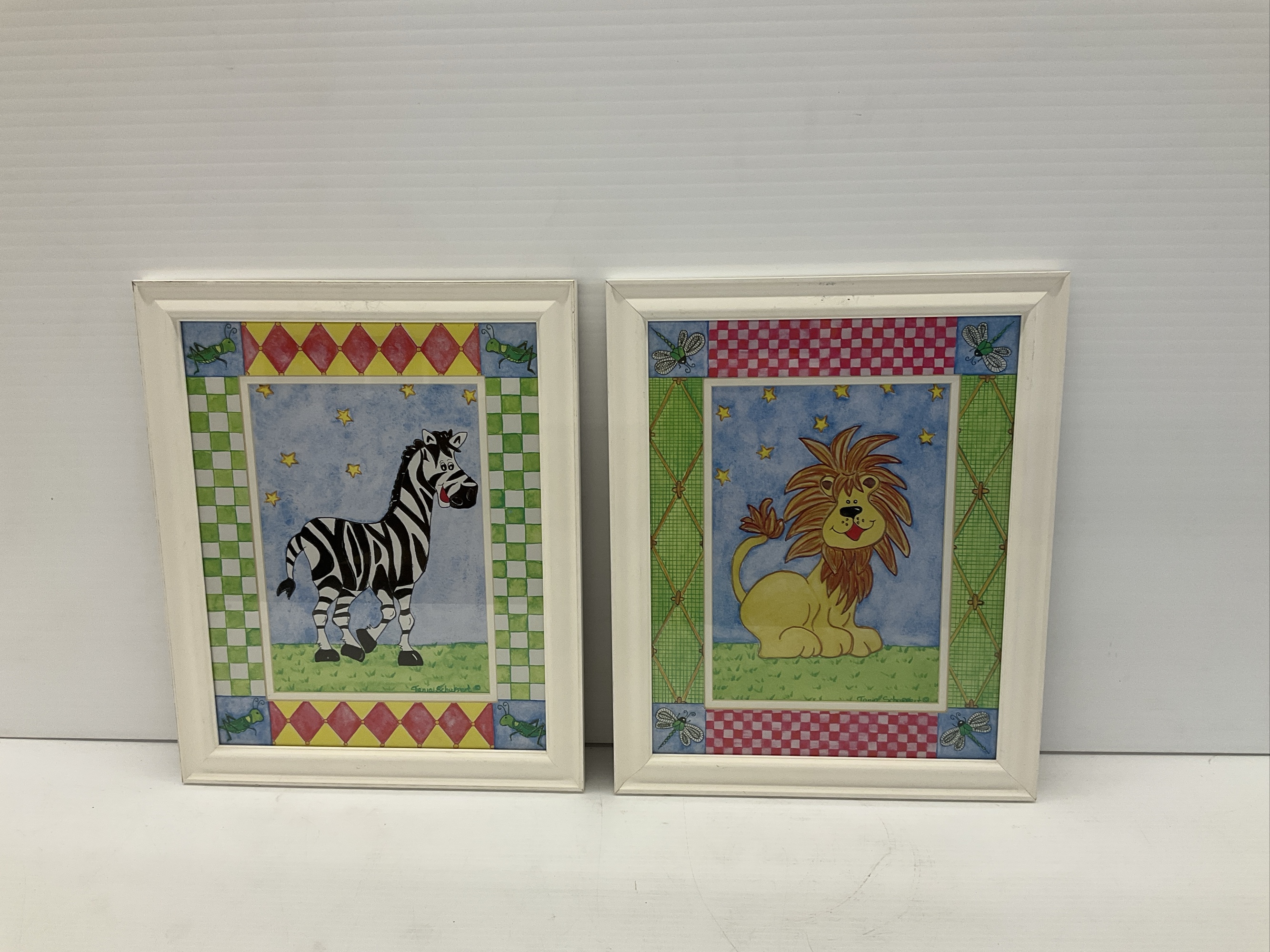 This listing includes two framed prints from the Zoo Safari collection by Tania Schuppert. Each print features a playful animal design, one depicting a lion and the other a zebra. These charming pieces would be a delightful addition to any child's room or artwork collection. 16 x 13 in.