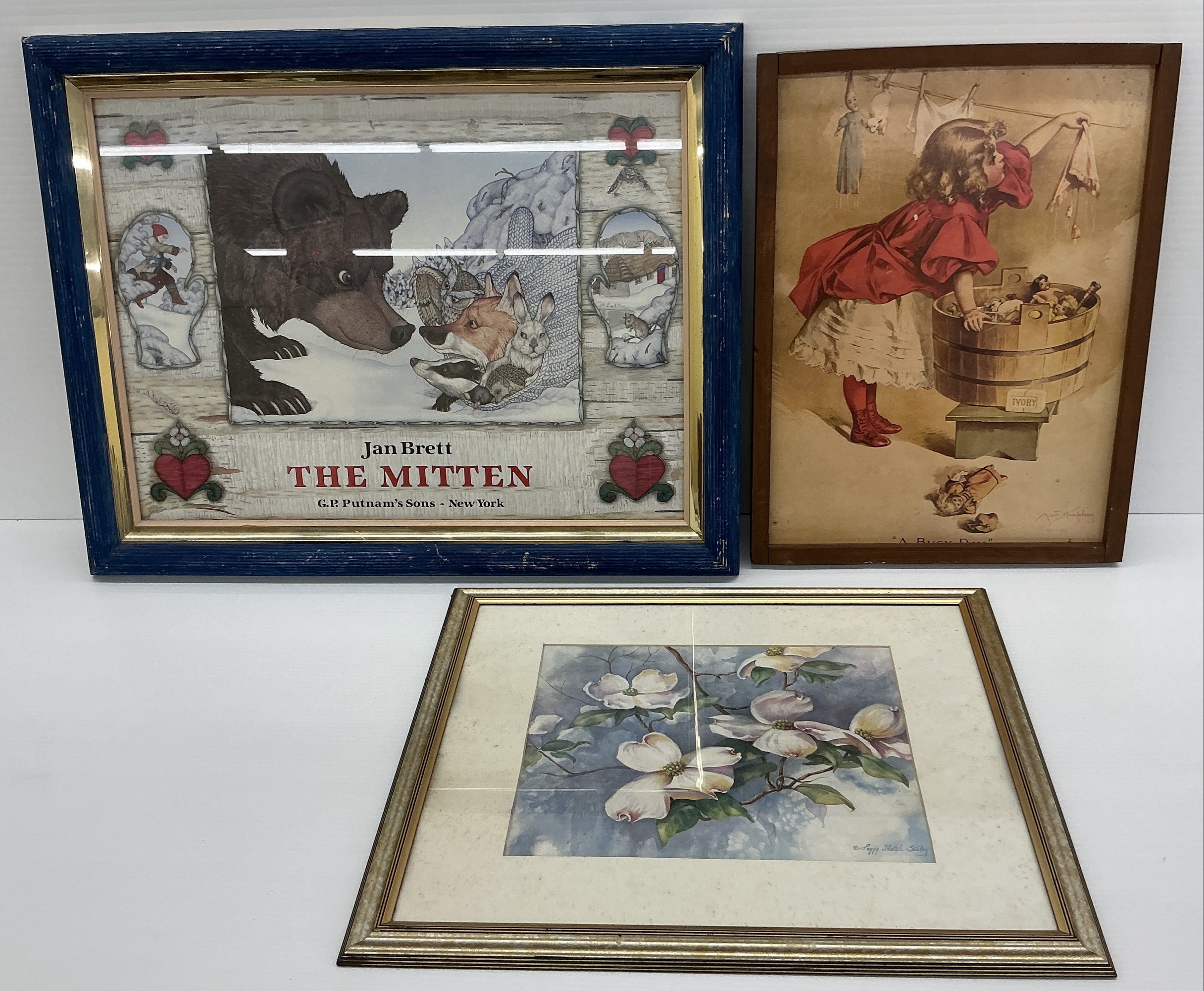 Three framed artworks including a print of Jan Brett's "The Mitten" book cover, a print titled "A Busy Day" signed by Maud Humphrey, and a watercolor print of dogwood blossoms signed by Peggy Thatch Sibley. Largest 22 x 28 in.