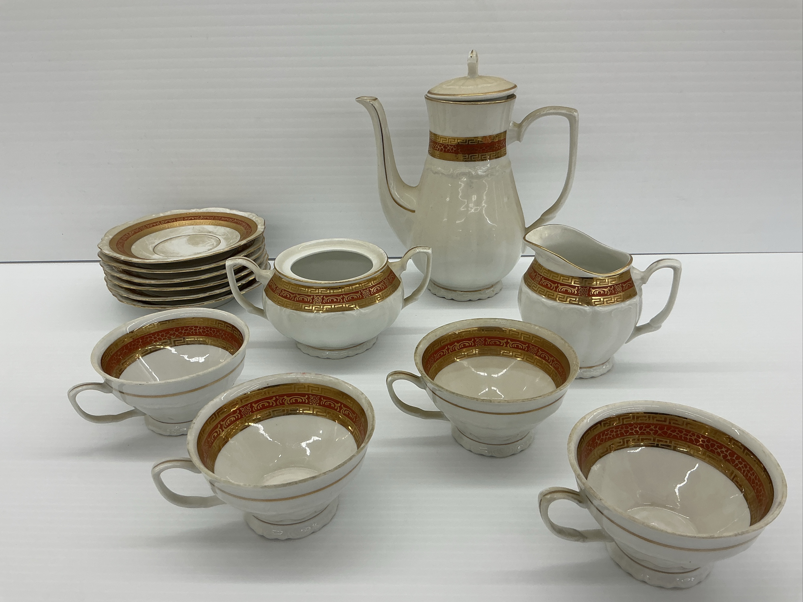 Elegant Poland tea set featuring a cream color porcelain with a striking red and gold geometric design trim. The set includes a teapot, sugar bowl, creamer, cups, and saucers, perfect for afternoon tea or display. Missing a lid. Tallest 9 in.
