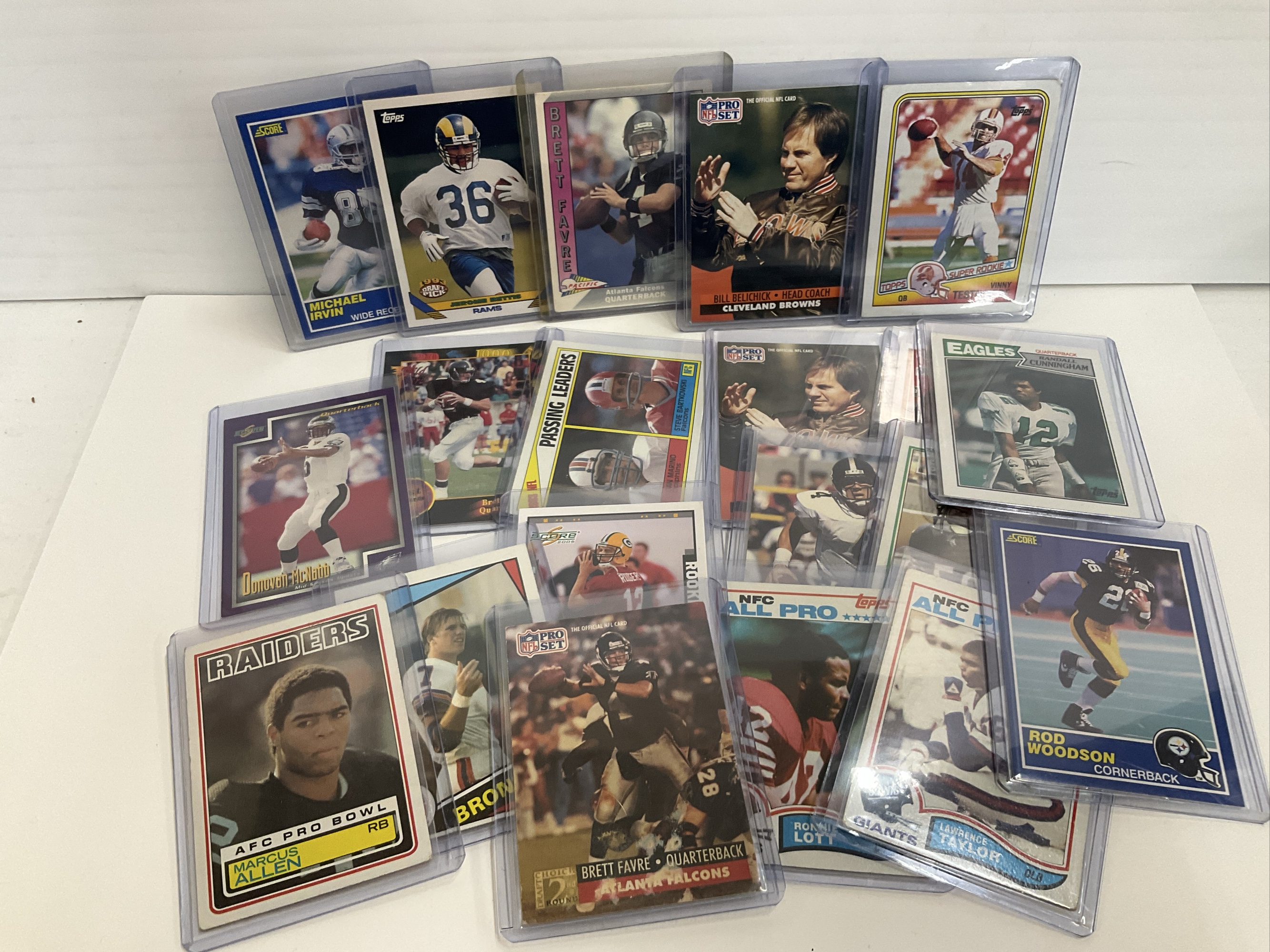 This lot includes a collection of various football trading cards featuring NFL players from different teams. Cards include notable names such as Brett Favre, Cleveland Browns, Ronnie Lott, and Marcus Allen. Great for collectors or sports enthusiasts.