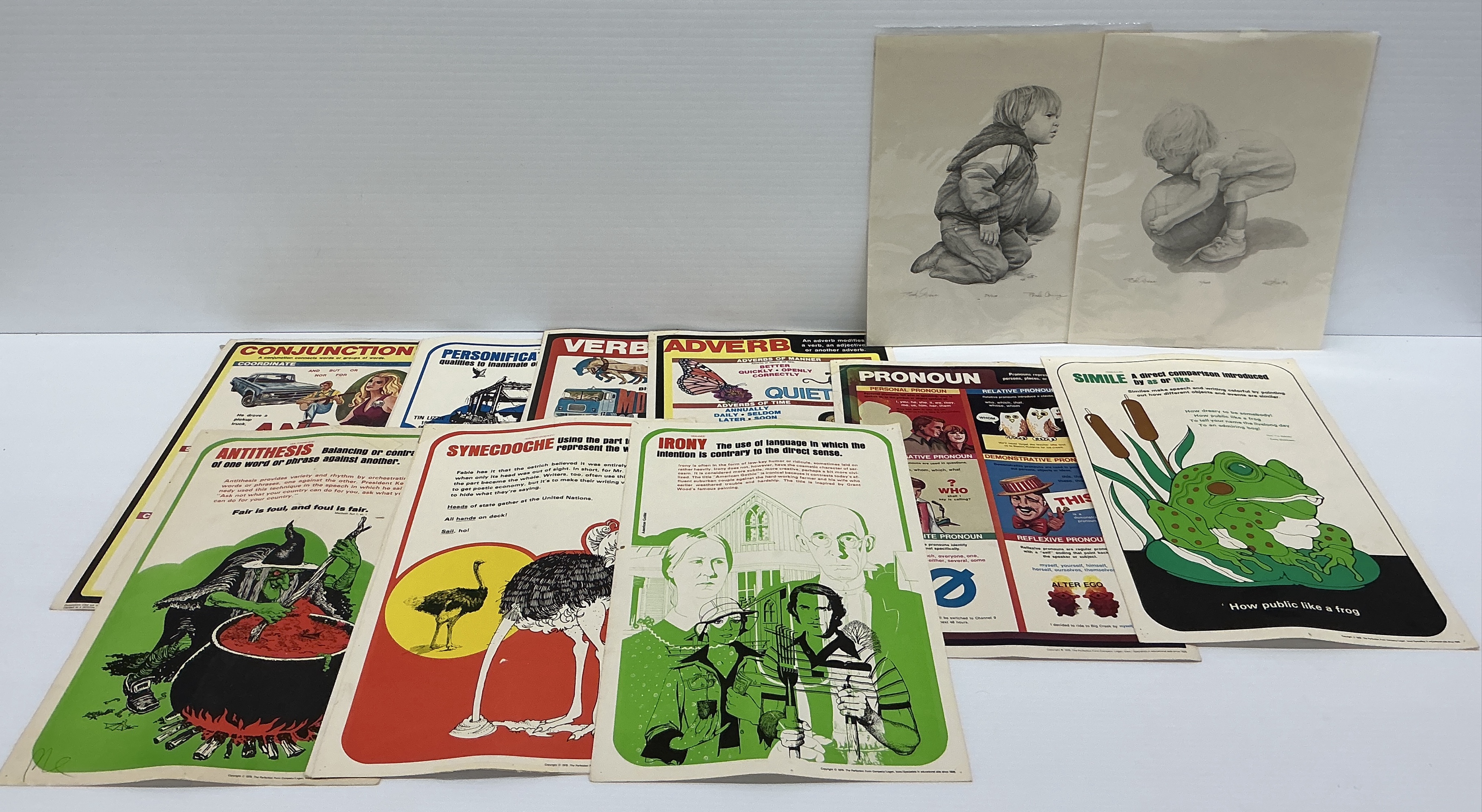 This lot includes two signed and numbered art prints by Bob Giese, each featuring children. Additionally, there are several educational posters from The Perfection Form Company, copyright 1976, covering various aspects of grammar and language. Largest 17 x 11 in.