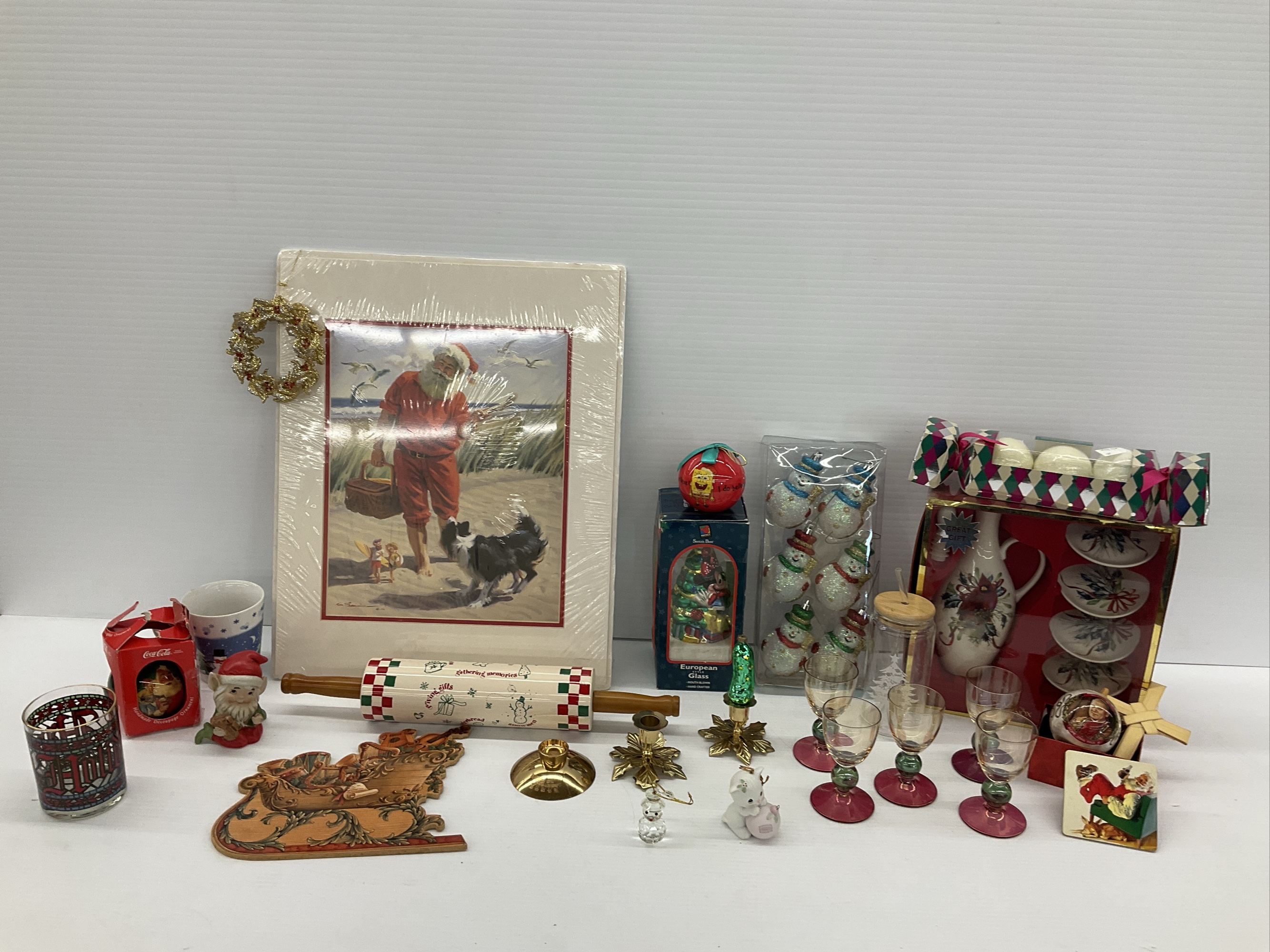 Collection of holiday and Christmas themed items including a Lenox oil cruet set, a framed print of Santa on the beach, a holiday themed rolling pin, Coca-Cola ornaments, decorative glasses, gold candle holders, bath bombs, a Crystal Diamond snowman ornament, a Spongebob ornament, a mug, decorative ornaments and more. Largest 20 x 16 in.