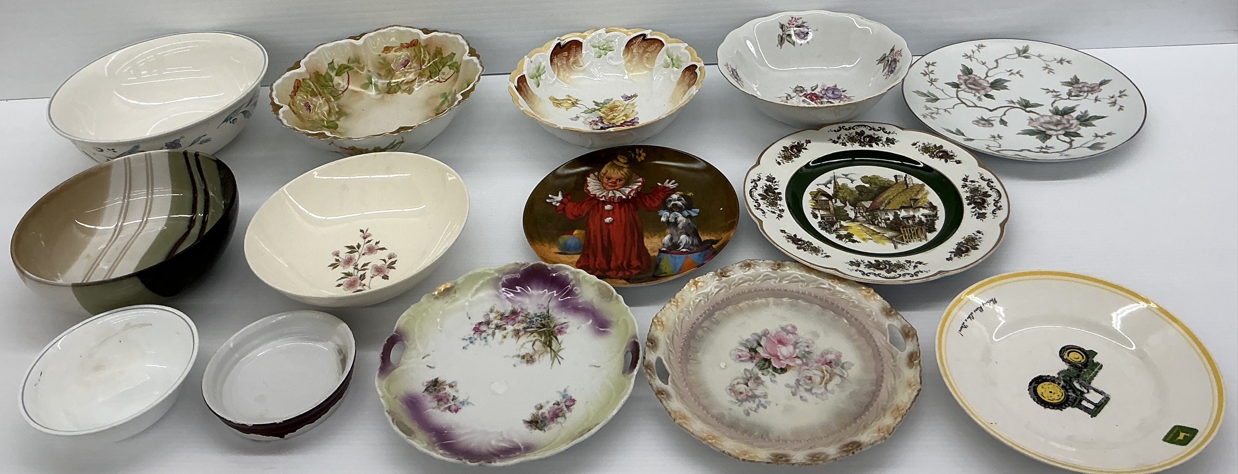 These bowls and plates include brands such as Corelle, Home Trends Jazz, M.v.Co, M.Z. Austria, and an Acme Garden Center Warner Bros 1993 plate. Largest 11 in. dia.