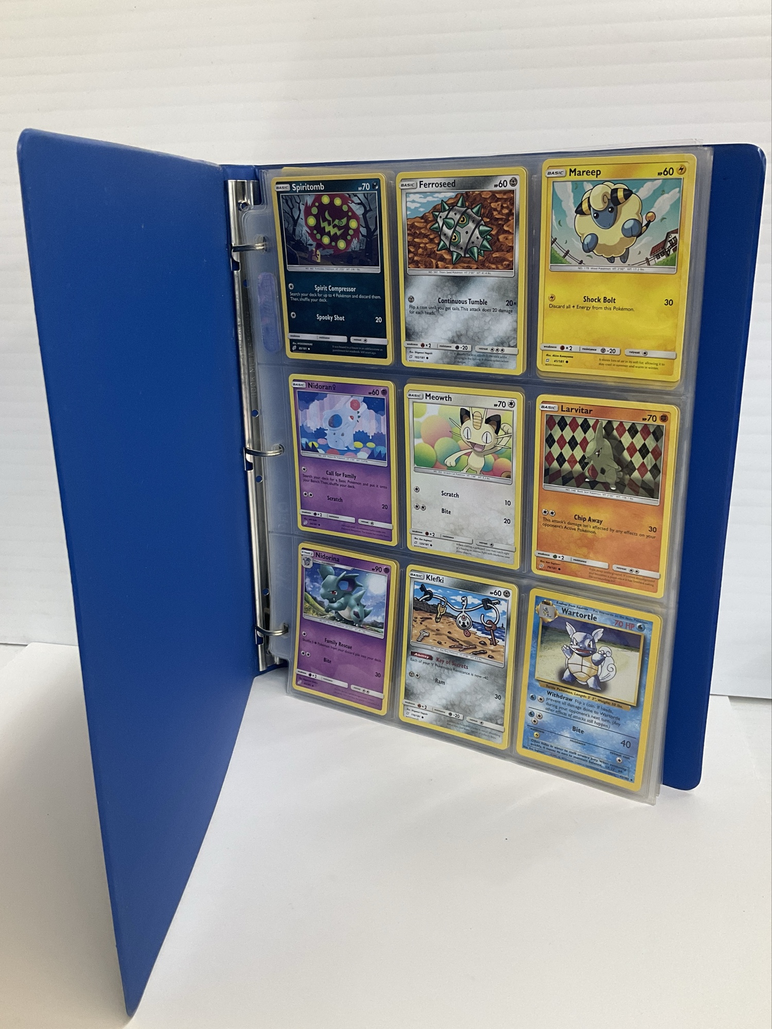 Collection of assorted Pokémon trading cards stored in a blue binder. Includes various characters and card types.
