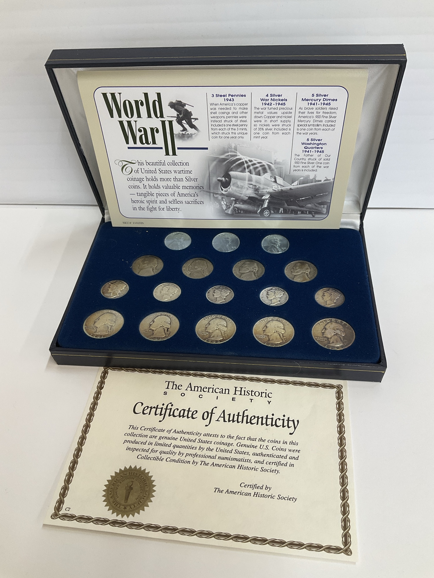 Complete set of U.S. wartime coins from World War II, housed in a presentation case. Includes a certificate of authenticity from The American Historic Society. Includes silver coins.
