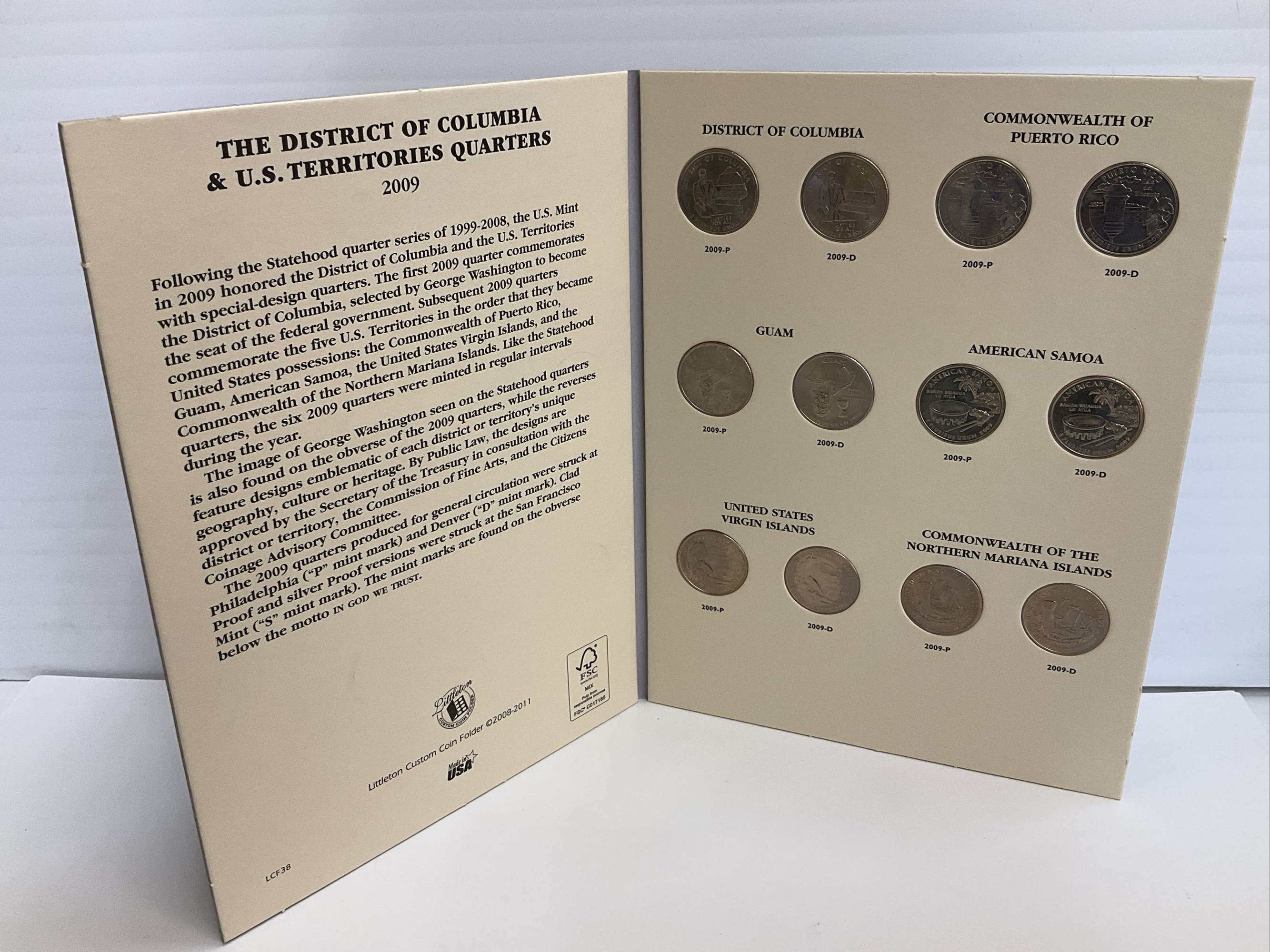 Complete 2009 District of Columbia and U.S. Territories Quarter Program Collection. Includes quarters representing the District of Columbia, Commonwealth of Puerto Rico, Guam, American Samoa, United States Virgin Islands, and Commonwealth of the Northern Mariana Islands. Each territory includes a Philadelphia (P) and Denver (D) minted quarter.