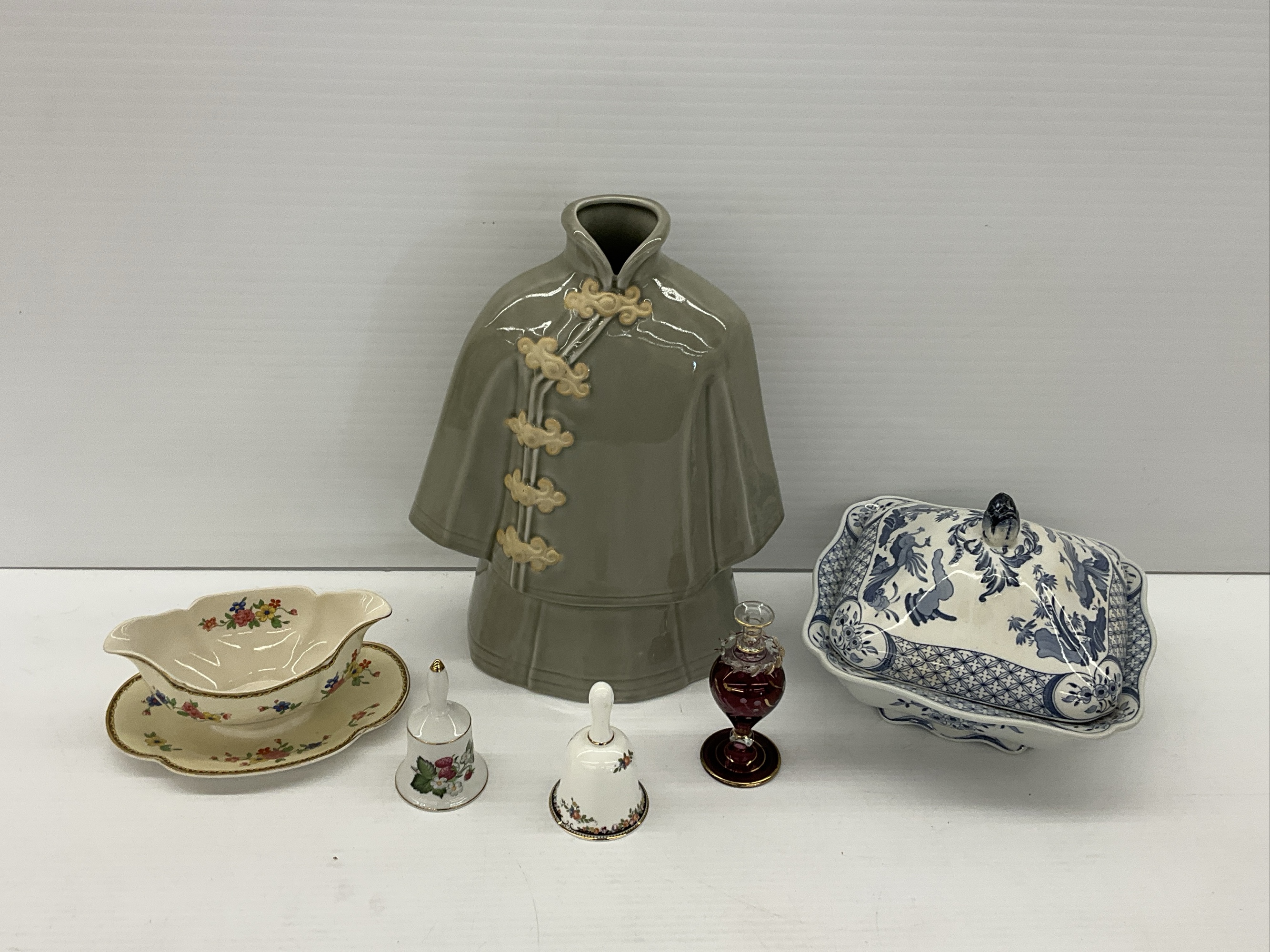 You're bidding on an assortment of decorative items including ceramic bells, a lidded bowl, a robe-shaped vase, and a gravy boat. Brands featured are Wedgwood, World Market, and others from England and Japan. Largest 15 x 11 in.