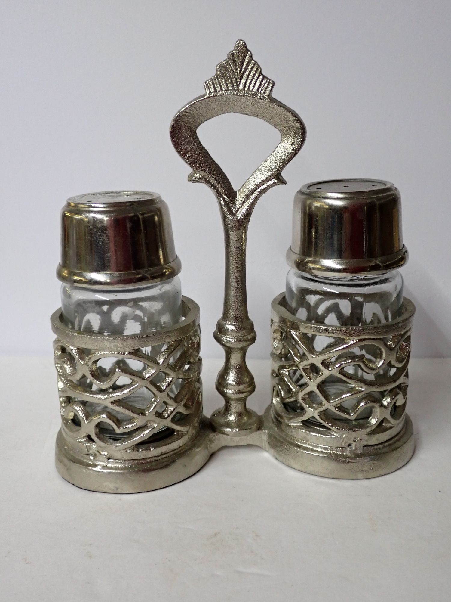 Silver Tone Salt and Pepper Shaker Set with Stand