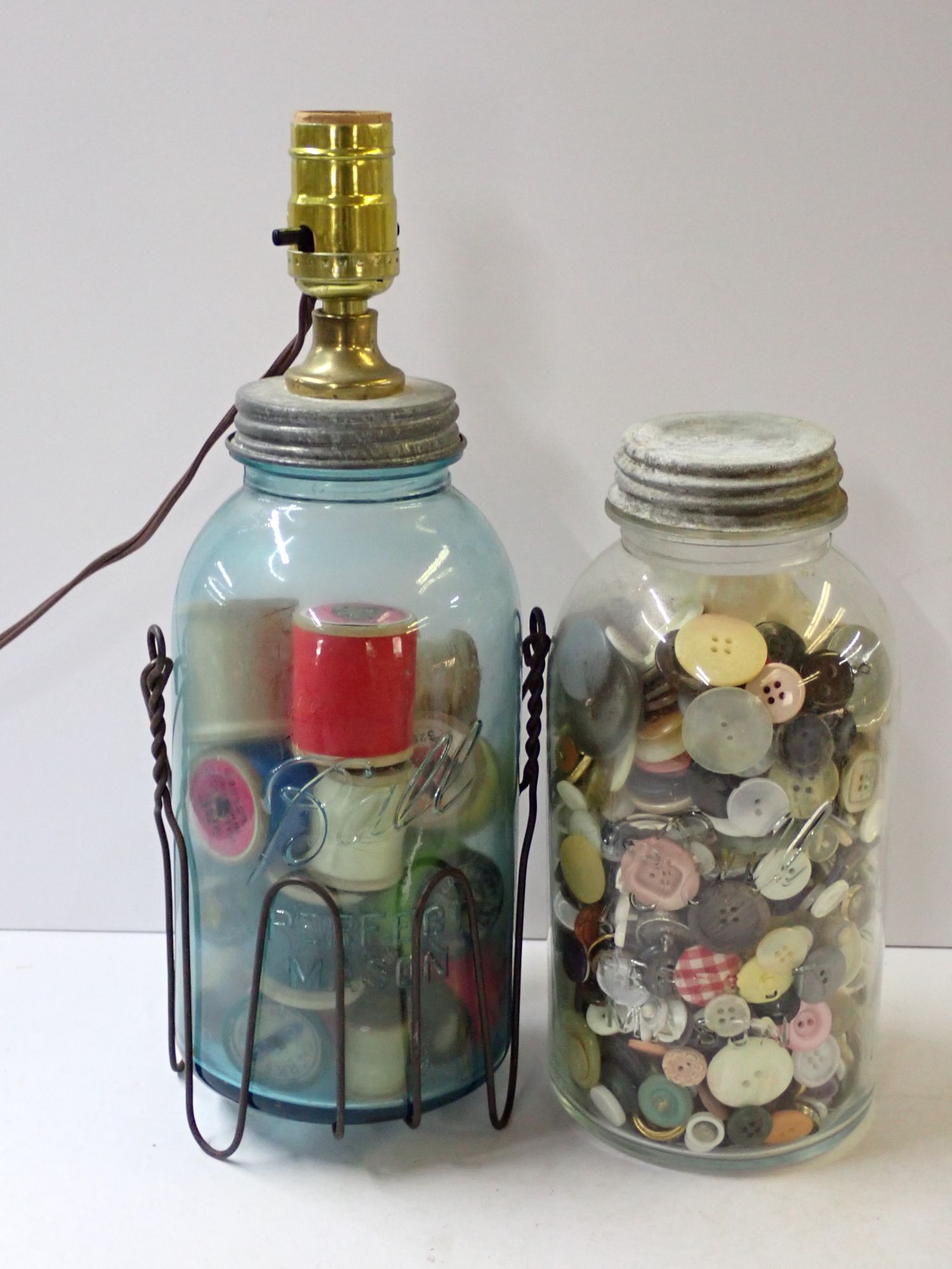 Ball Mason Jar Thread Filled Lamp and Jar filled with Vintage Buttons