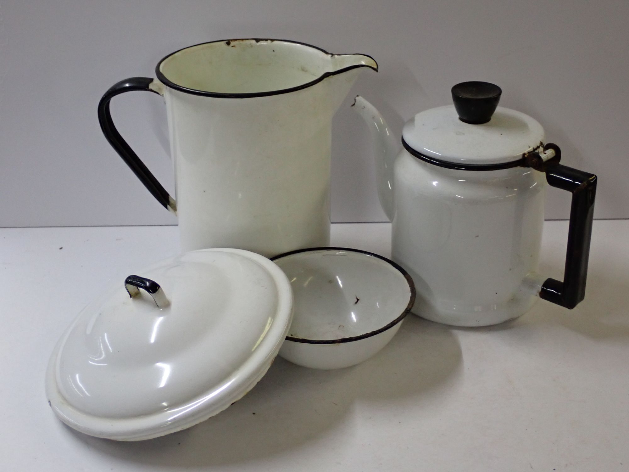 White Enamelware Pitcher, Teapot, Lid, and Bowl