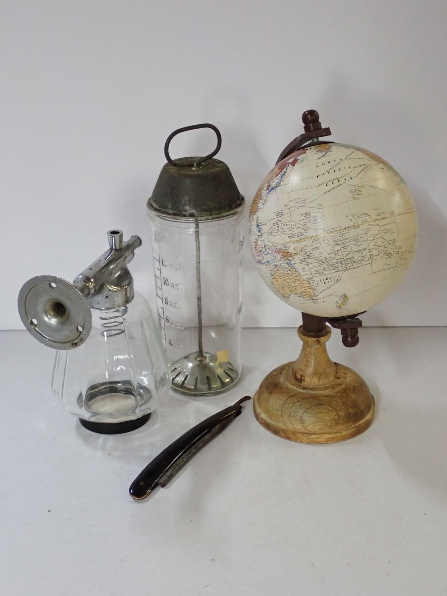 Vintage Collectible Items - Globe(w/damage), Mixer, Sprayer, and Straight Razor