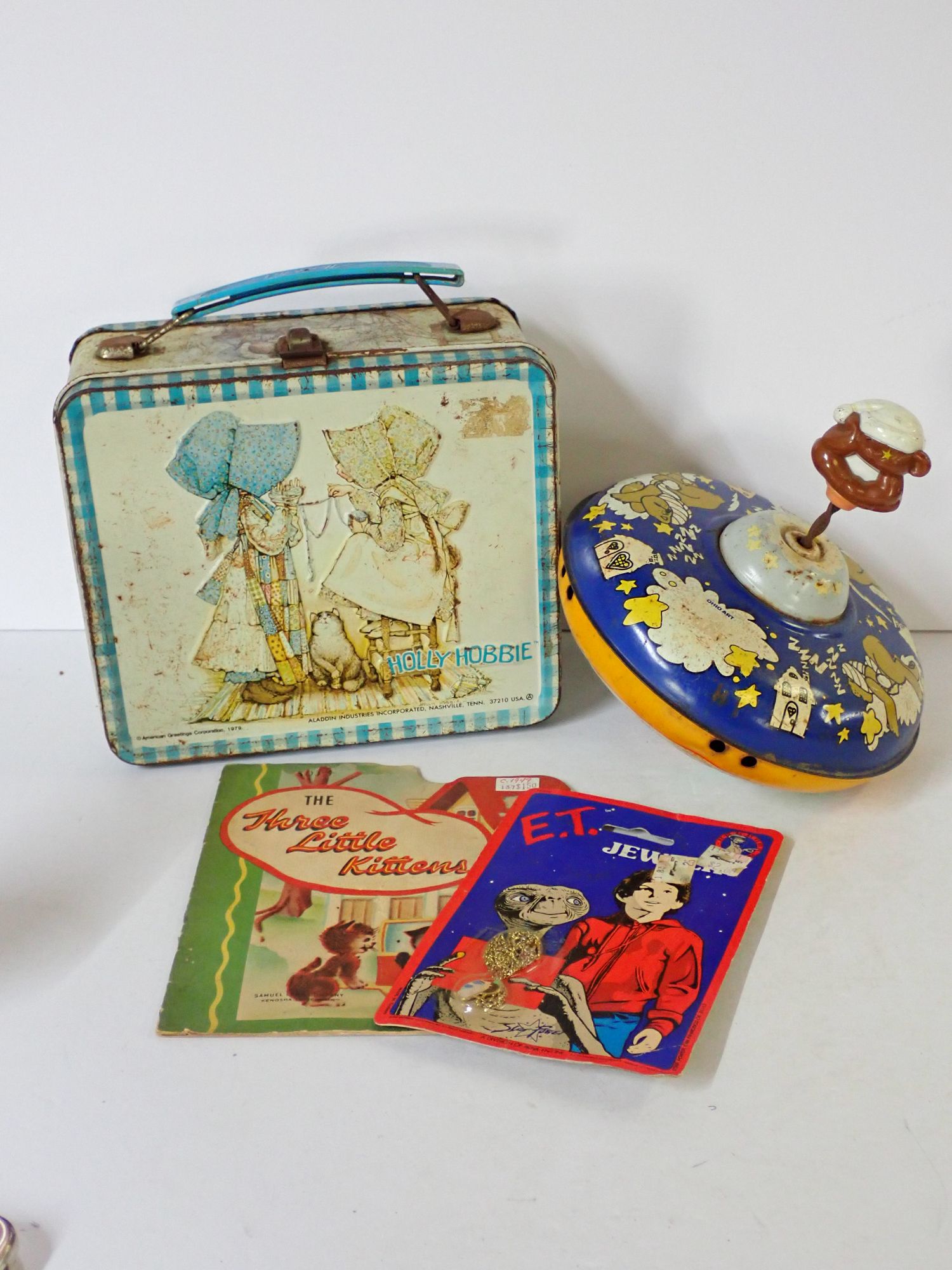 Vintage Holly Hobbie Lunchbox, Ohio Art Spinning Top, E.T. Necklace, and Three Little Kittens Book