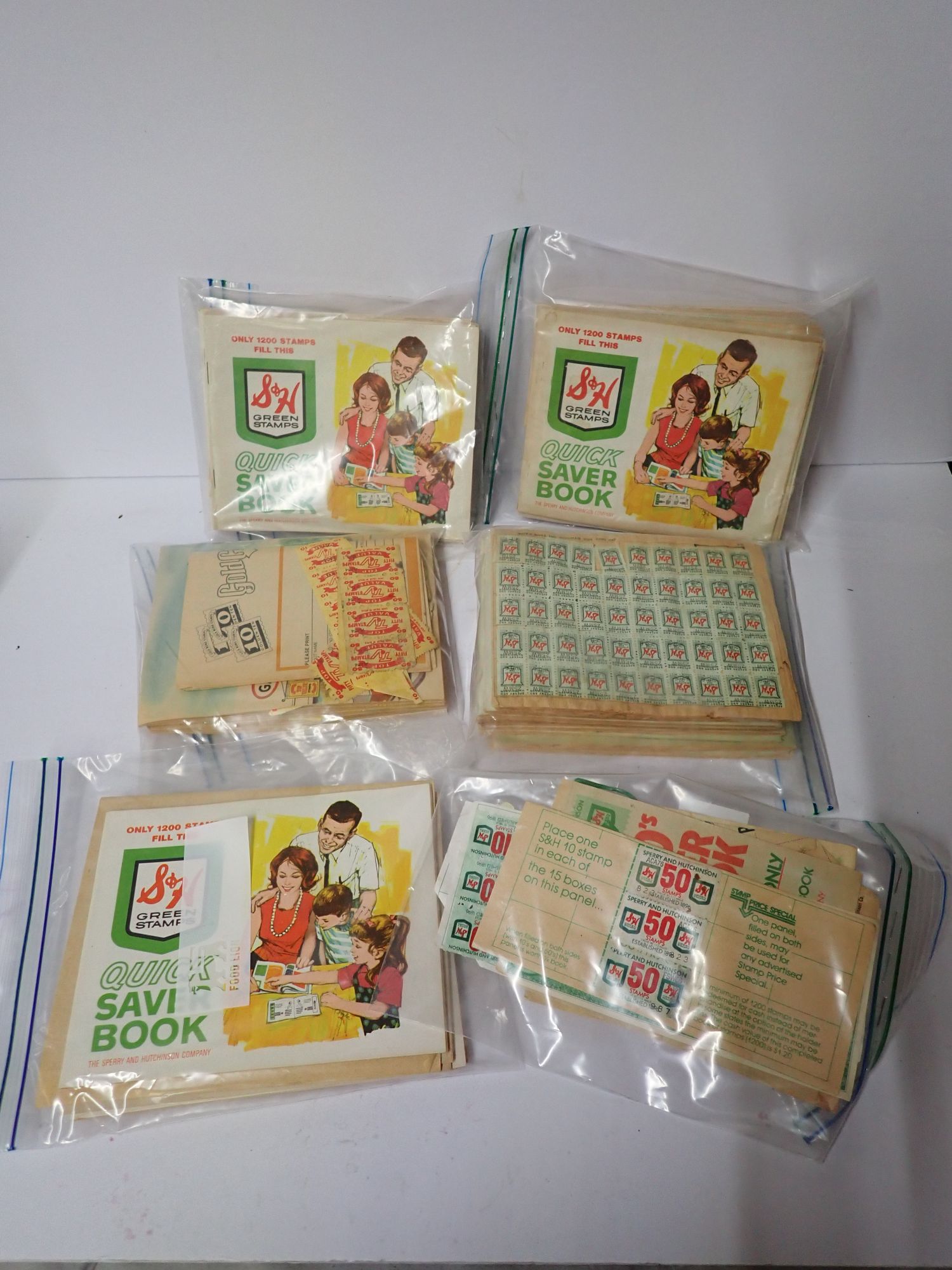 Collection of S&H Green Stamp Saver Books and Individual Stamps