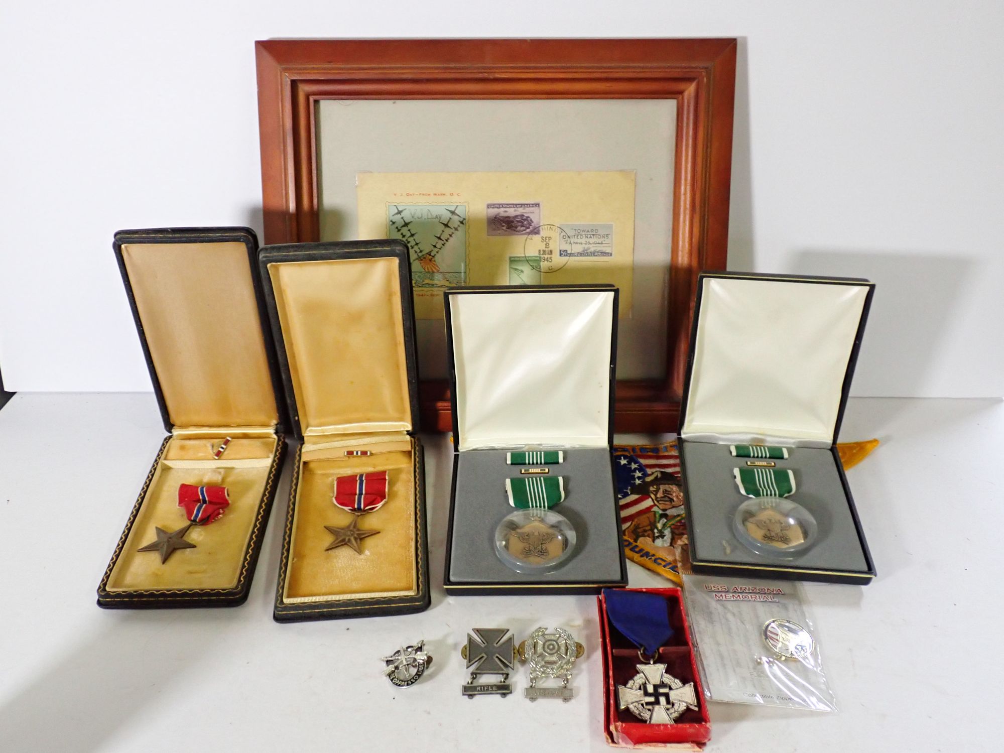 Military Medals, Pins, and VJ Day Commemorative Envelope