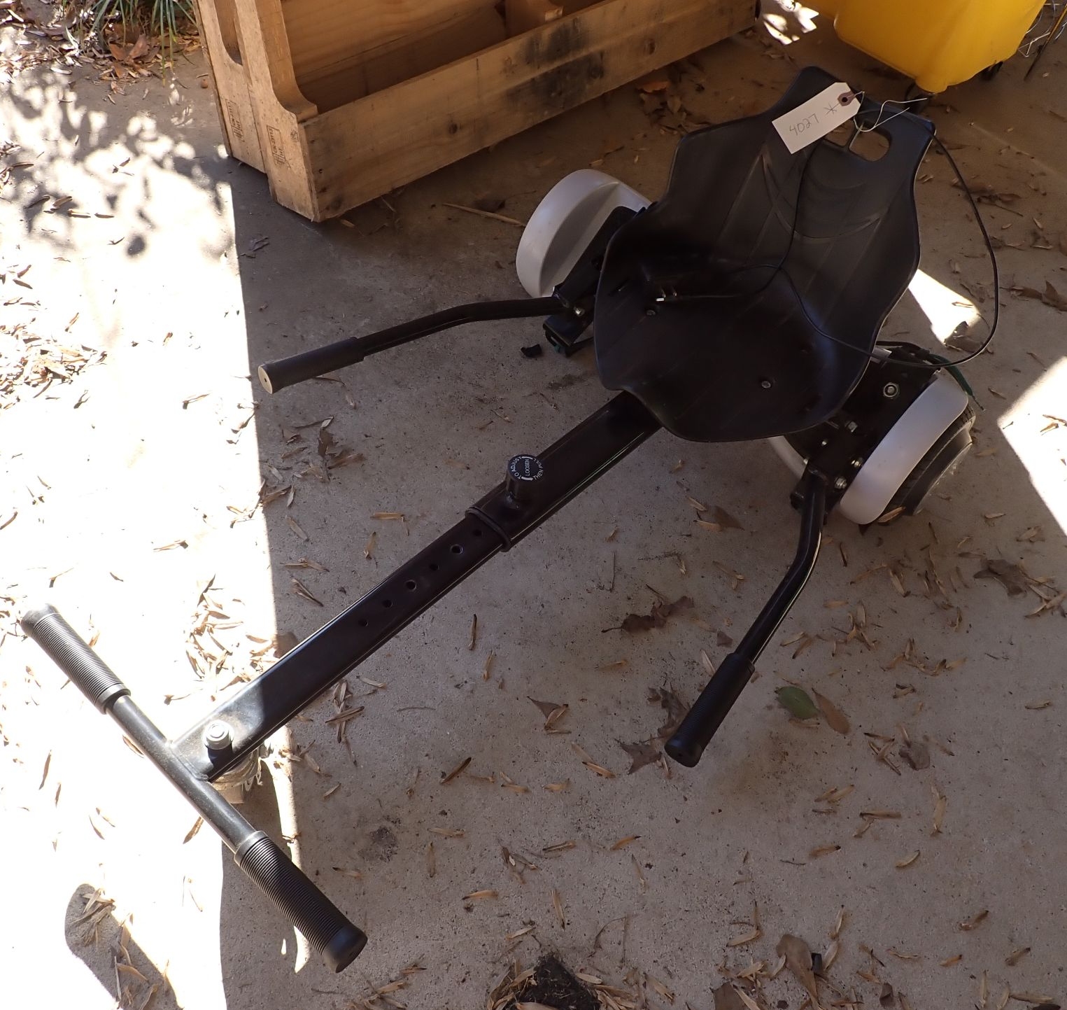 NEEDS NEW BATTERY. POWERS UP BUT WILL NOT HOLD CHARGE. SEAT CONTRAPTION IS DETACHABLE AND NEEDS NEW VELCRO STRAPS. CURRENTLY USING STRING TO HOLD IN PLACE. THE HOVER BOARD CAN BE USED WITH OR WITHOUT THIS ACCESSORY.