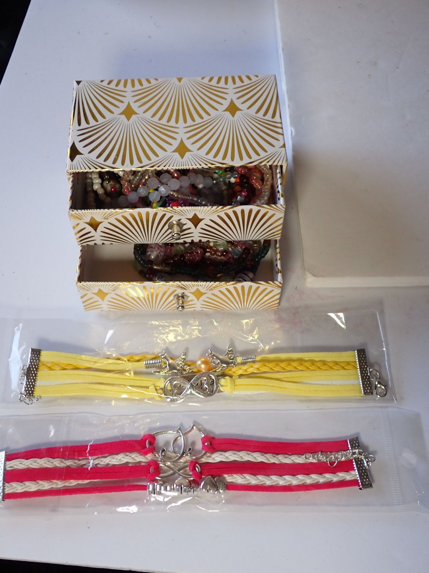 Assorted Jewelry Collection including Beaded Bracelets and Box