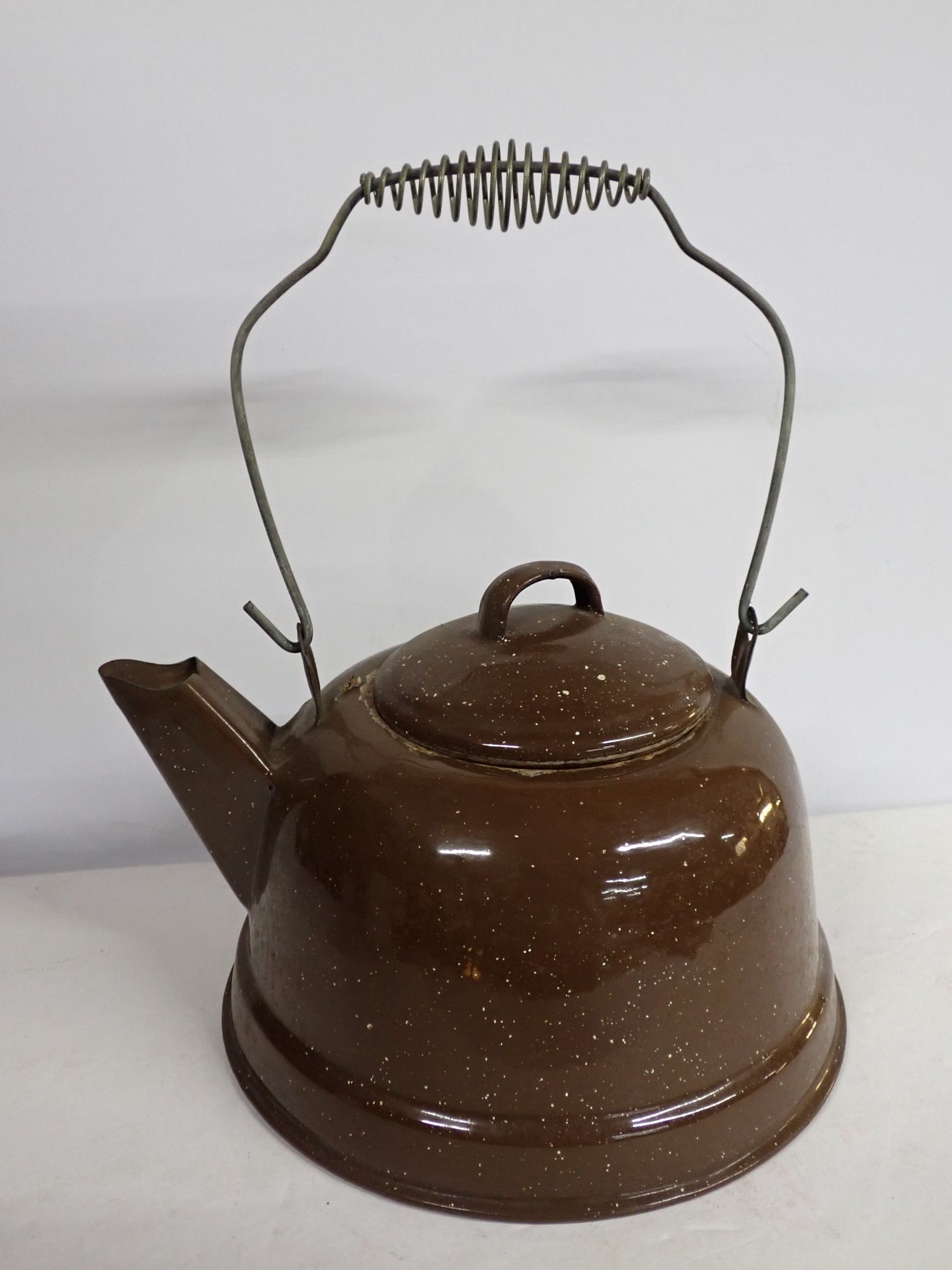 Speckled Brown Enamelware Tea Kettle with Wire Handle