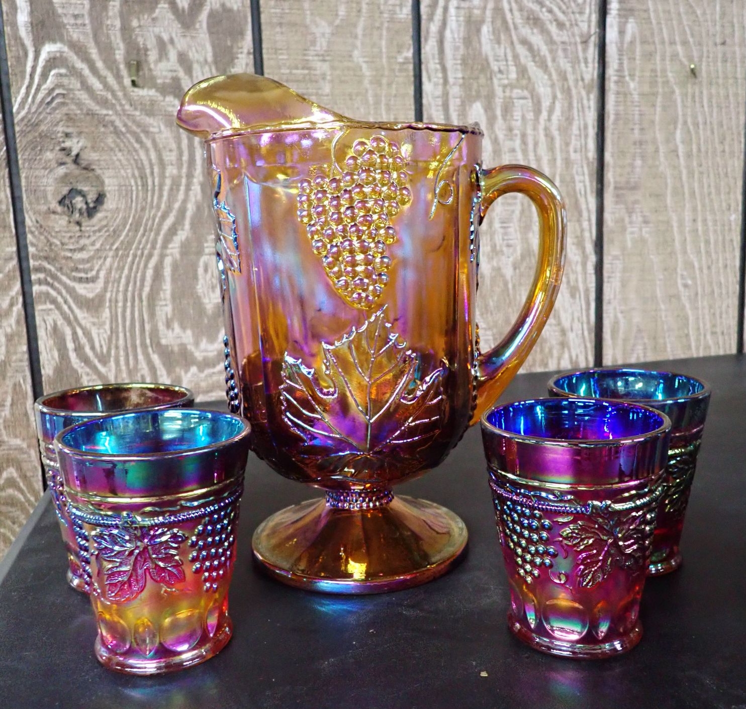 Indiana Carnival Glass Pitcher and St. Claire Tumbler Set